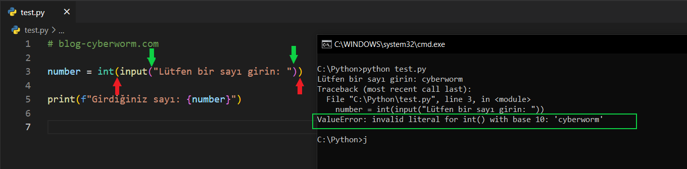 Kırmızı ve yeşil oklara çok dikkat edin. Kırmızı oklarla gösterdiğim parantezler 'int()' ifadesine ait iken yeşil oklarla gösterdiğim parantezler, 'int()' içerisine girilen ve 'input()'a verilen metinsel ifadenin parantezleridir.