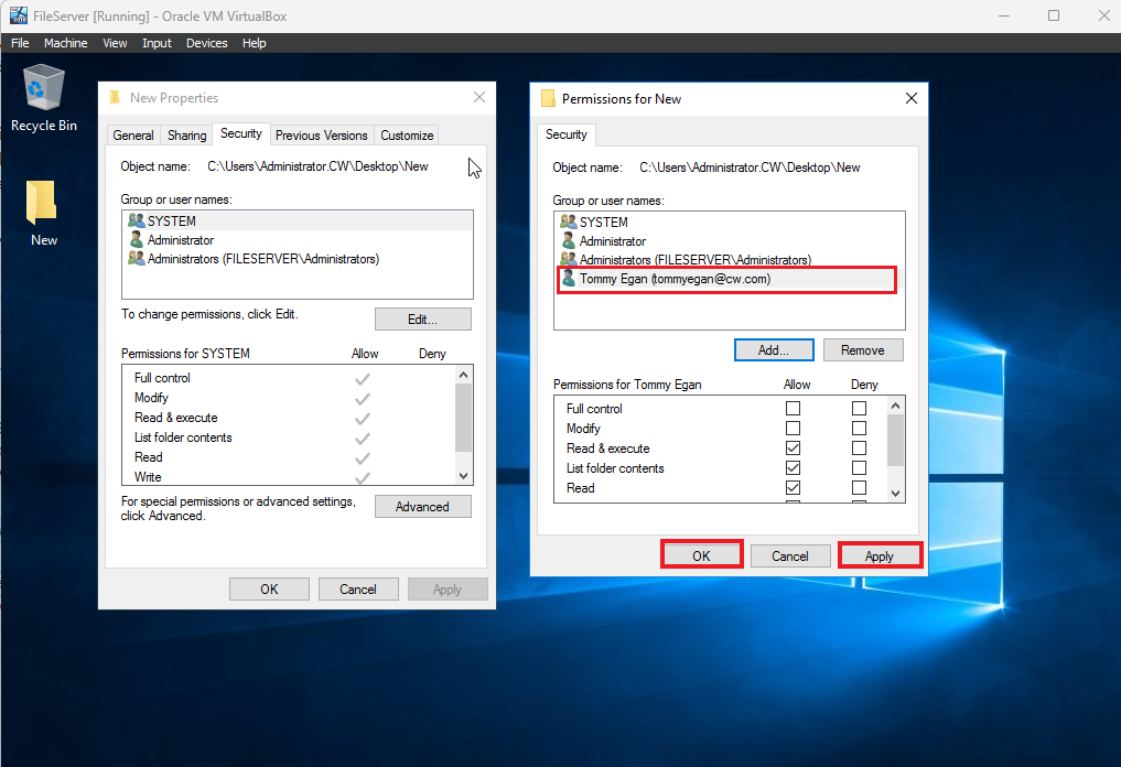 Pencereyi kapattıktan sonra Tommy arkadaşımızın yetkili kişi ve grupların arasında bulunduğunu görebilirsiniz. Burada yapacağınız şey ilk önce Apply sonra da OK butonuna tıklamak ve pencereyi kapatmak. Şimdi, Windows11 makinenin Tommy Egan oturumuna dönelim.