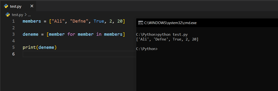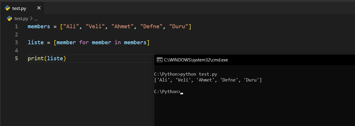 liste = [] derken zaten bir liste oluşturduğumuzu biliyorsunuz. İçerisindeki for member in members ise bildiğiniz, klasik bir for döngüsü. Ancak en başta bulunan member bizi biraz sıkıntıya sokabilir.