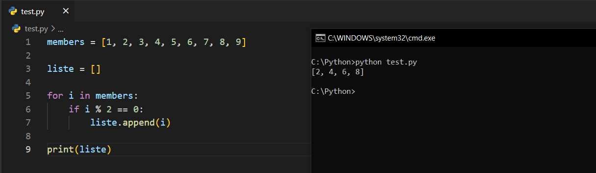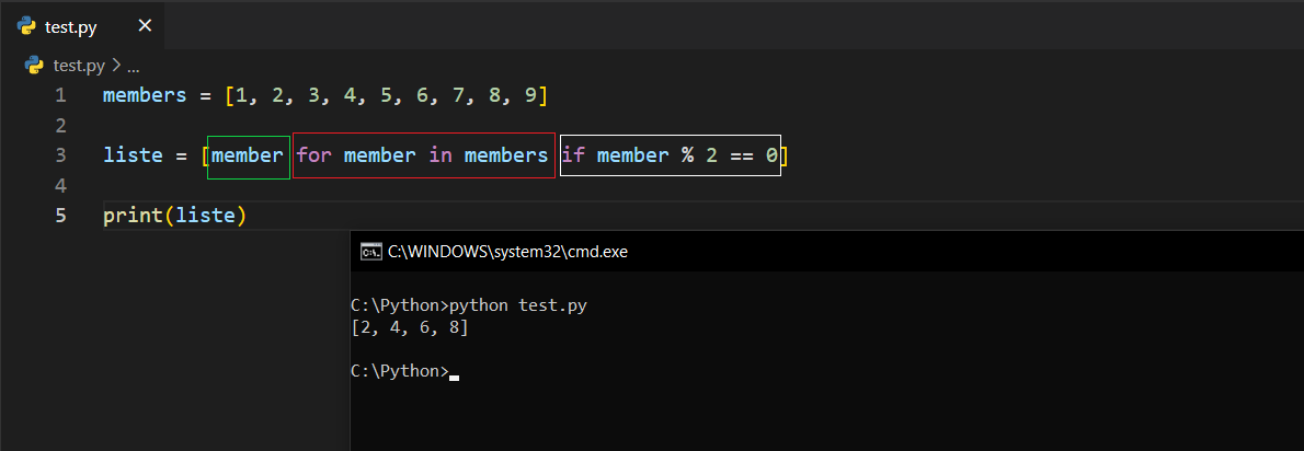 Burada, liste.append(i*i) kodunun karşılığı member*member ifadesidir. Geri kalan yerler ise tamamen aynı for döngüsü mantığıdır. İşleri biraz daha karıştırıp bu defa çift sayıları listeye ekleyelim.