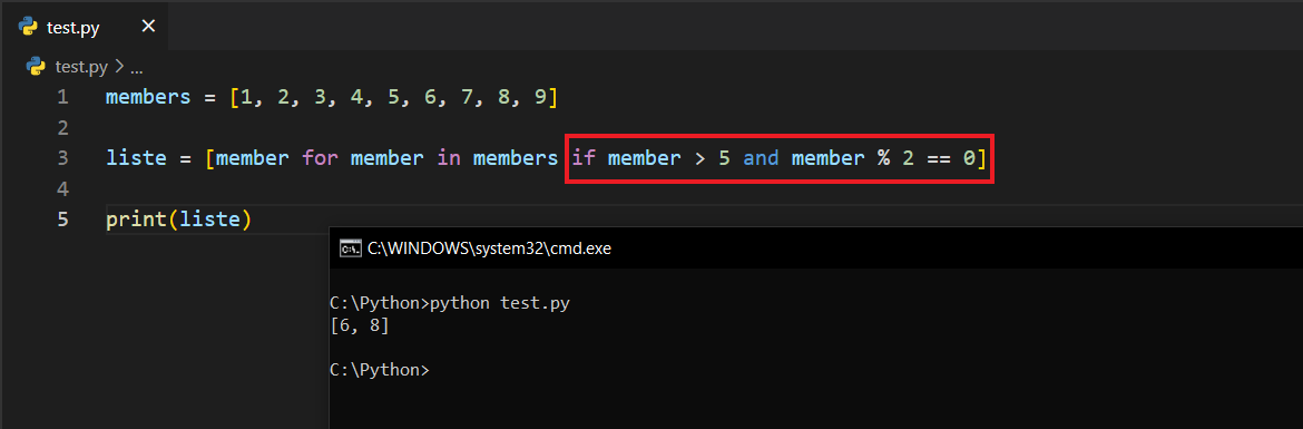 Bu ifade ile listedeki değerler arasından 5'ten büyük ve çift olan sayıları ele aldık; gayet verimli ve güzel bir şekilde çalıştı. Aynı zamanda iki tane for döngüsü de yazabilirsiniz: