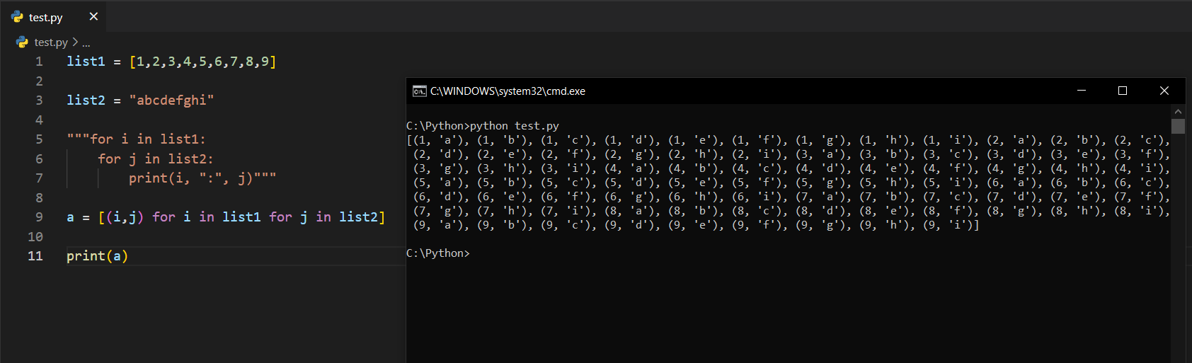 Bu örnekte list1 ile list2 elemanlarını birbirine eşleştirdik. a değişkeninin tuttuğu değere bakarsanız i ve j değişkenlerinin bir Tuple içerisinde olduğunu görürsünüz. List Comprehension kullanırken birden fazla değişken kullanılacaksa bu şekilde bir kullanım sağlanmalıdır.