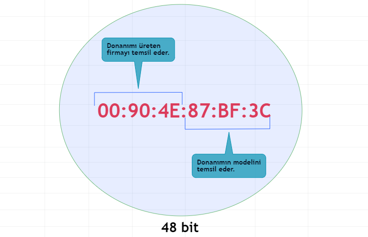 MAC Adresi dediğimiz şey genellikle cihazların Ağ Arabirim Denetleyicisi (NIC – Network Interface Controller) üzerinde bulunur. 6 oktetten ve her okteti iki karakterden (harf veya sayı) oluşur, her oktet de ‘:’