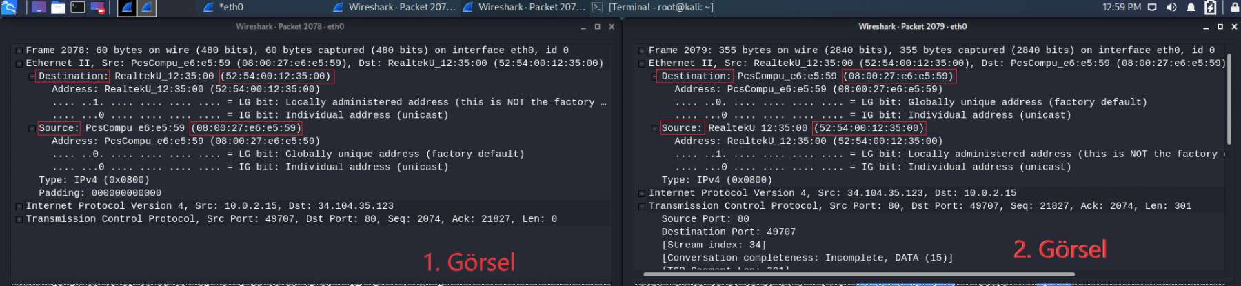Yukarıdaki görselde bir veri alışverişini görüyorsunuz. Bu veri alışverişi normalde IP adresleri arasında olur ama arka planda MAC Adreslerinin karşılaştırıldığını unutmayınız. Sol tarafta işaretlemiş olduğum ‘Source’ kısmının karşısında paketi gönderen cihazın MAC Adresini görüyorsunuz. ‘Destination’ kısmının karşısında ise paketi alan cihazın MAC adresini görüyorsunuz.
