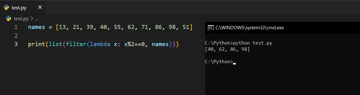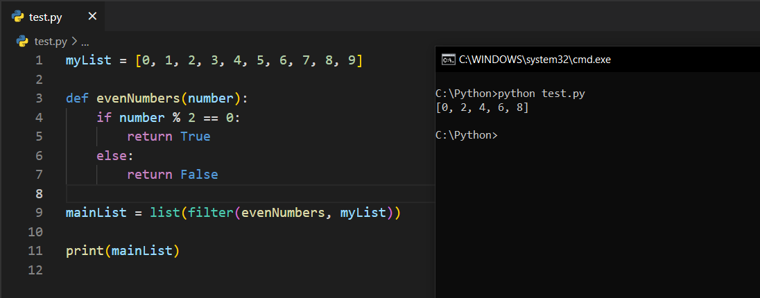 Listemiz yine aynı. Ancak, bu seferki fonksiyonuz çift sayıları bulmakla görevli bir fonksiyon. Sonrasında list(filter(evenNumbers, myList)) diyerek filtreleme işlemini yapıyoruz ve ekrana çift sayıların geldiğini görüyoruz.