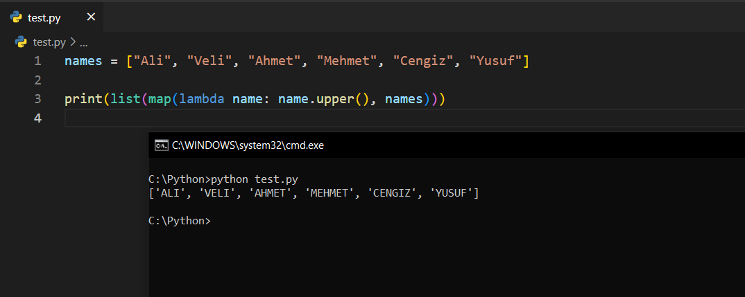 Sonrasında map() içerisine girip iki adet argüman vermemiz gerekiyor. Bu argümanlardan biri bir fonksiyon, diğeri ise bir liste olmalıdır. Bu yüzden ben map() içerisine bir lambda fonksiyonu koyduktan sonra bir virgül atıyorum ve listemin adını veriyorum. Son yapımız şu şekilde: print(list(map(lambda name: name.upper(), names)))