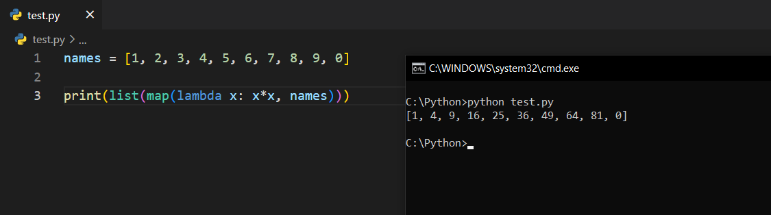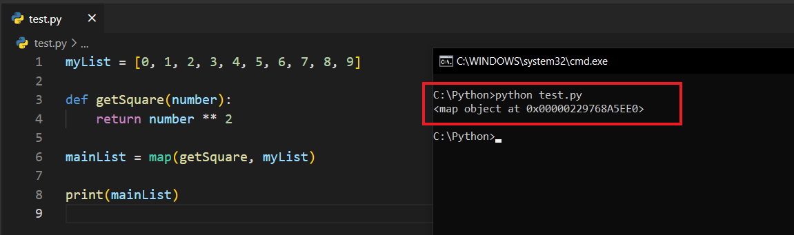 Dikkat ederseniz ekrana herhangi bir "elemanlarının karesi alınmış liste" gelmedi. Bunun yerine, mainList'in bir map objesi olduğunu söylüyor. Gerçekten de öyledir. Burada bir liste elde etmek için, blogun başında gördüğünüz gibi map(...) demek yerine list(map(...)) dememiz gerekir. Oradaki list() ifadesi, mainList değişkeninin bir listeye dönüşmesini sağlamaktadır. Bu değişikliği yapıp kodu tekrar çalıştıralım.
