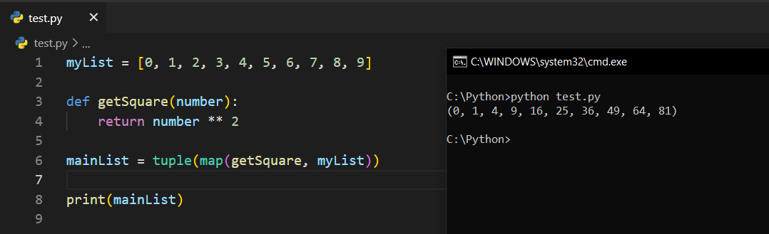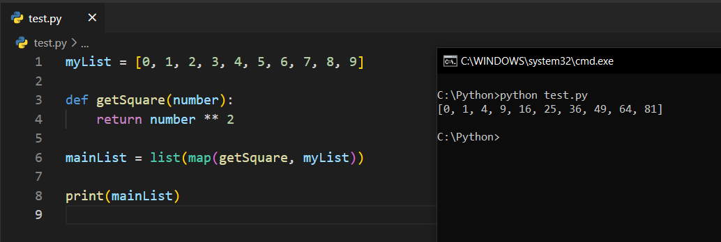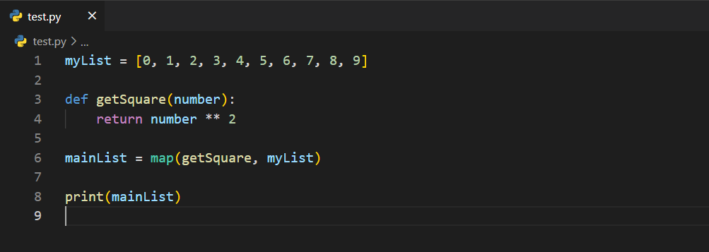Dikkat edelim; listemizin adı myList ve içerisinde 0'dan 9'a kadar olan sayılar mevcut. Bu noktada ben, def getSquare(number): şeklinde bir fonksiyon tanımladım ve return number ** 2 diyerek kare alma işlemini döndürdüm.