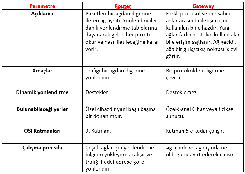 Router ile Gateway'in karıştırılabileceğini düşündüm. Bu yüzden sizin için şöyle ufak bir tablo hazırladım.