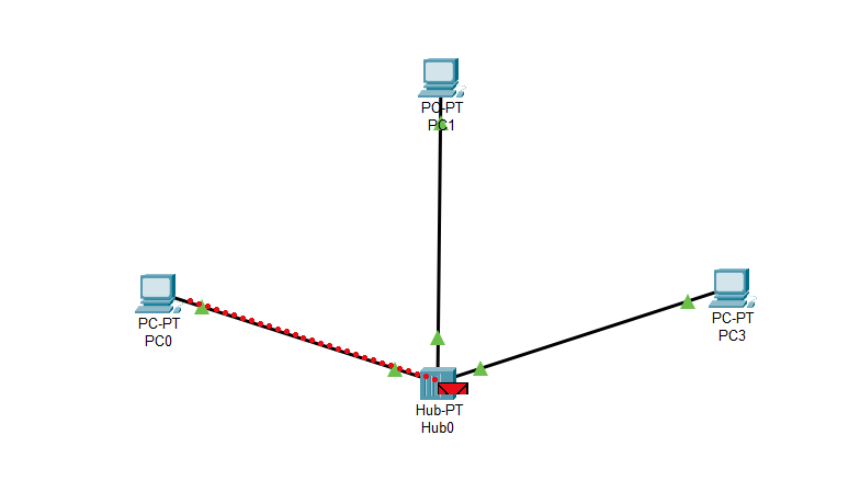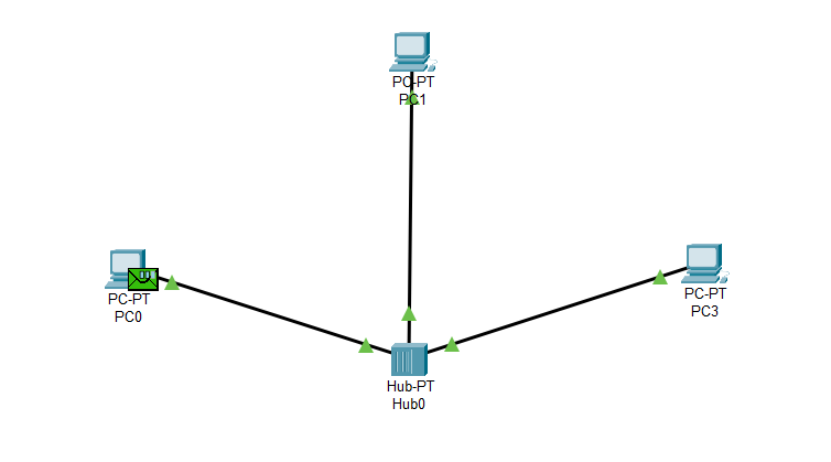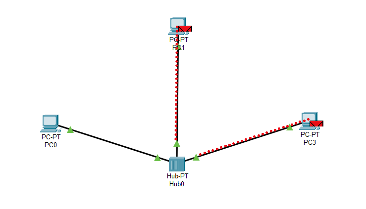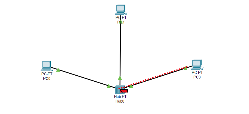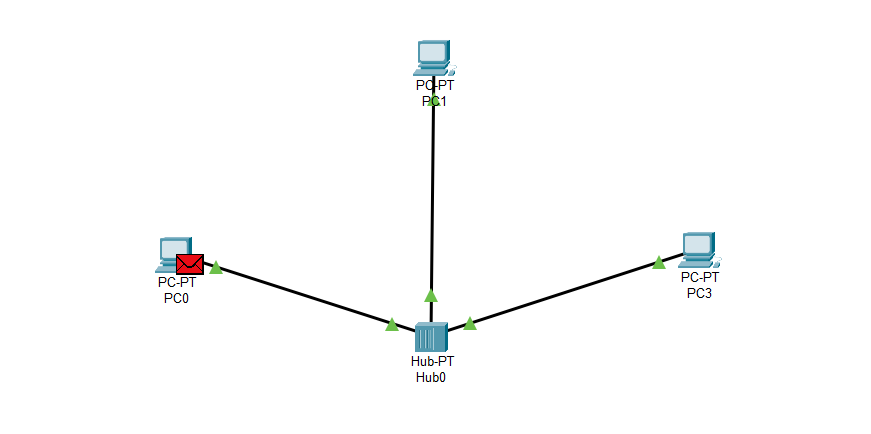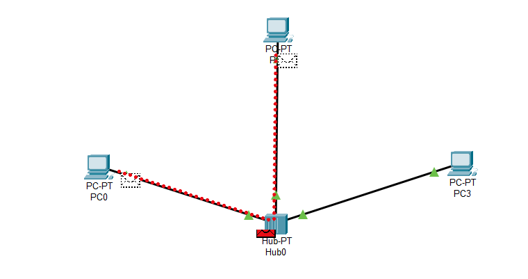 Şimdi, ortada bir Hub'ımız ve çevresinde 3 adet bilgisayarımız var. Bilgisayarların adı 'PC-PT PC0, PC1, PC3' şeklinde gösteriliyor. PC0 üzerinde kırmızı bir zarf görüyorsunuz. Bu zarf, veriyi temsil ediyor. Biz, bu veriyi PC3'e yollamak istiyoruz. Gelişen olaylara bakalım.