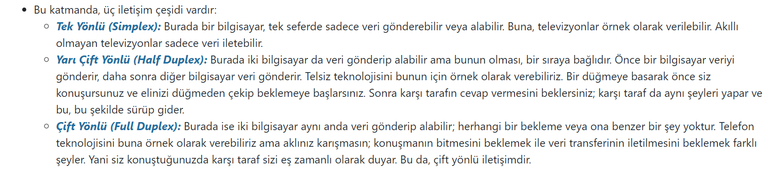 Hub'lar, half-duplex iletişimi destekler. Yani bilgisayarlar aynı anda veri gönderip alamazlar. Bu konu hakkında OSI Katmanları blogumuzdan bir hatırlatıcı ekliyorum.