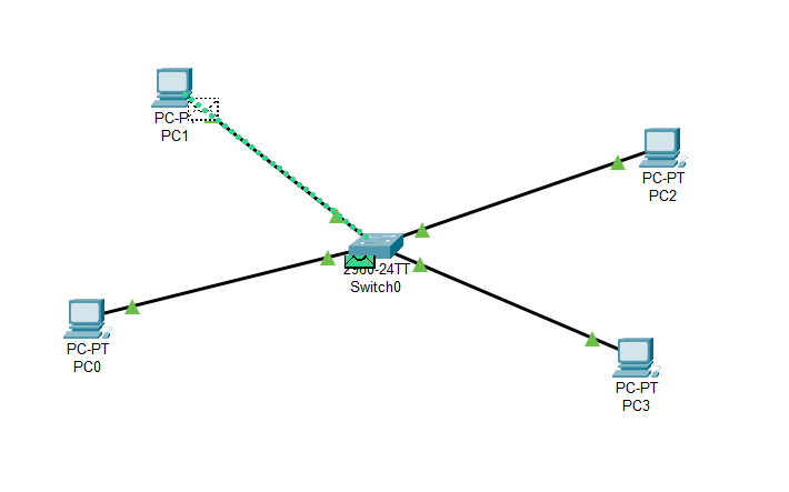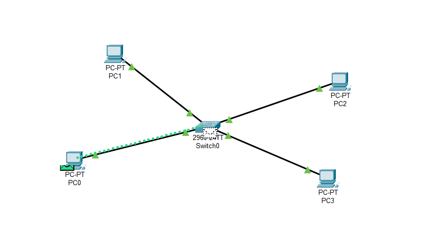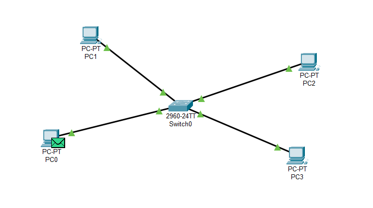 Yukarıdaki görselde sırasıyla 1 adet Switch'imiz ve 4 adet bilgisayarımız bulunuyor. Biz, PC0'dan PC1'e bir veri göndermek istiyoruz ve istediğimiz için yeşil zarf PC0'da bekliyor. Şimdi ne olacak?