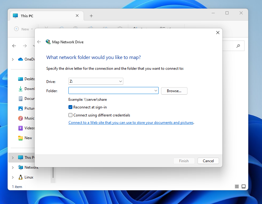 Karşınıza şu şekilde bir pencere açılacaktır. Burada Drive: kısmından sürücünüzün adını seçmeniz lazım. Bir alt kısımda ise yani Folder: kısmında hangi paylaşılmış klasör adına bir sürücü oluşturacağınızı soruyor. Tommy arkadaşımız İstanbul'un Accounting departmanında yer alıyordu. Peki, bunu buraya nasıl yazacağız?