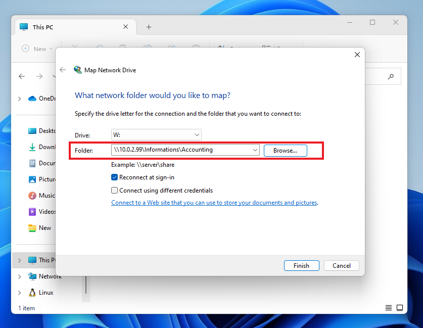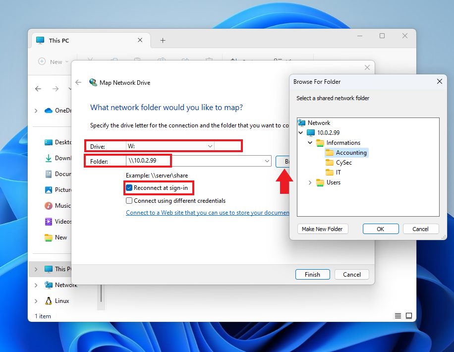 Drive ismimi W: olarak seçtim, siz de istediğiniz harfi seçebilirsiniz. Aşağı tarafta Reconnect at sign-in şeklinde bir etiket görüyoruz. Eğer bunu seçerseniz kullanıcı bilgisayarı her açtığında otomatik olarak bu bağlantı gerçekleşecek ve sürücü kullanıcıya gözükecektir. Folders kısmında ise yalnızca \\10.0.2.99 yazdım ve Browse butonuna tıkladım. Bu sayede bu makine zaten bir AD içerisinde olduğundan bu IP adresi içerisinde bulunan klasörleri getirdi ve bana seçtirdi. 10.0.2.99 > Informations > Accounting yolunu izleyerek OK diyorum.