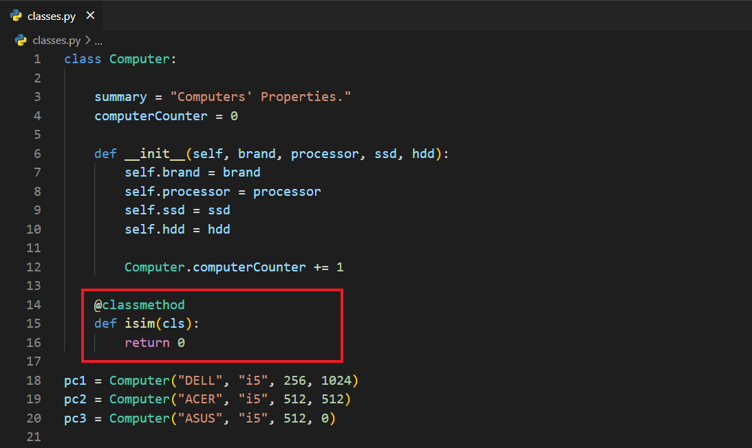 Dikkat ederseniz def isim(self): yazmak yerine def isim(cls): yazdım. Oradaki 'cls' ifadesi aslında 'class' kelimesinin kısaltılmışıdır. En başta class Computer şeklinde tanımladığımız class kelimesi ile karışmaması için cls şeklinde bir ifade geliştirmişler. Bu, self ile benzer bir iş yapar ve direkt olarak sınıfın kendisiyle ilgilendiğimizi anlatır. Yani bu fonksiyonun referansı, class yapısının kendisidir.