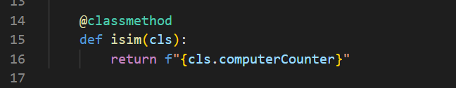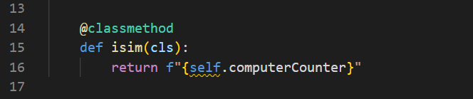 Dikkat ederseniz, self ifadesinin altı çizildi ve computerCounter ifadesi mavi değil, beyaz. Zaten kodu çalıştırırsanız ya da imleci üzerine götürürseniz hata verdiğini göreceksinizdir. İşte, isim isimli metot cls argümanını aldığı için yani sınıfın tam olarak kendisiyle ilgilendiği için çağırma işlemini self yerine cls ile yapıyoruz. Bakalım.