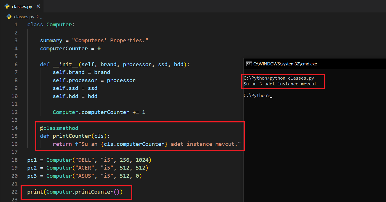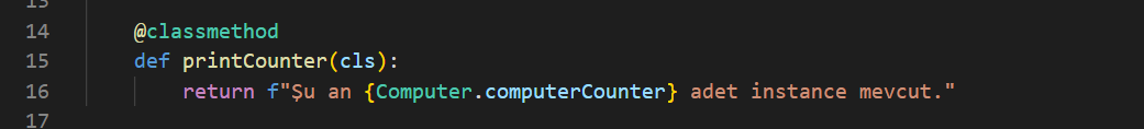 @classmethod ifademi ekledim ve altına printCounter(cls) şeklinde bir metot tanımladım. İçerisine de Computer.computerCounter dedim. Bu noktada bunun neden cls.computerCounter olmadığını merak edebilirsiniz. Biz, cls ile class yapılarının aynı olduğundan, cls ifadesinin class yapısının kendisiyle ilgilendiğini biraz önce öğrendik. Dolayısıyla cls.computerCounter ve Computer.computerCounter aynı şeyi ifade edecektir.