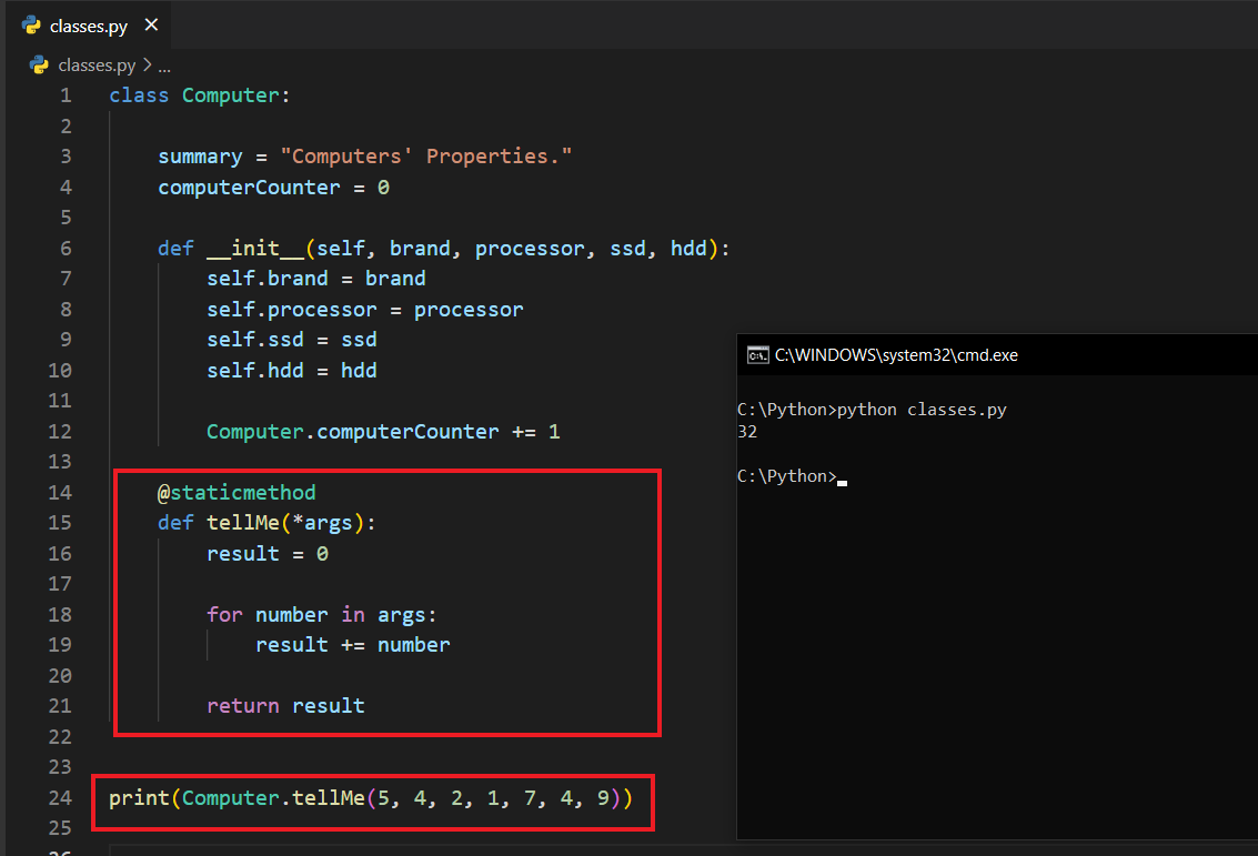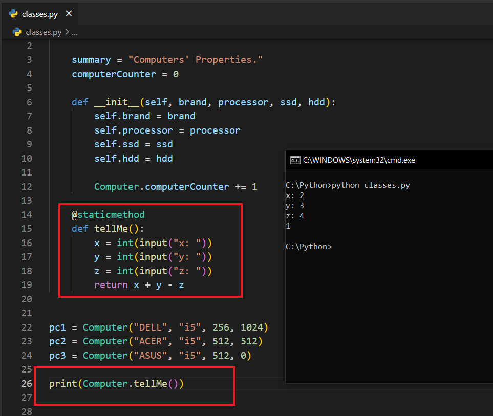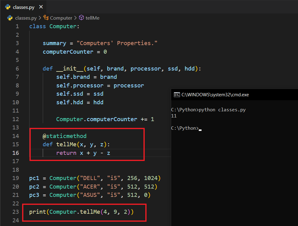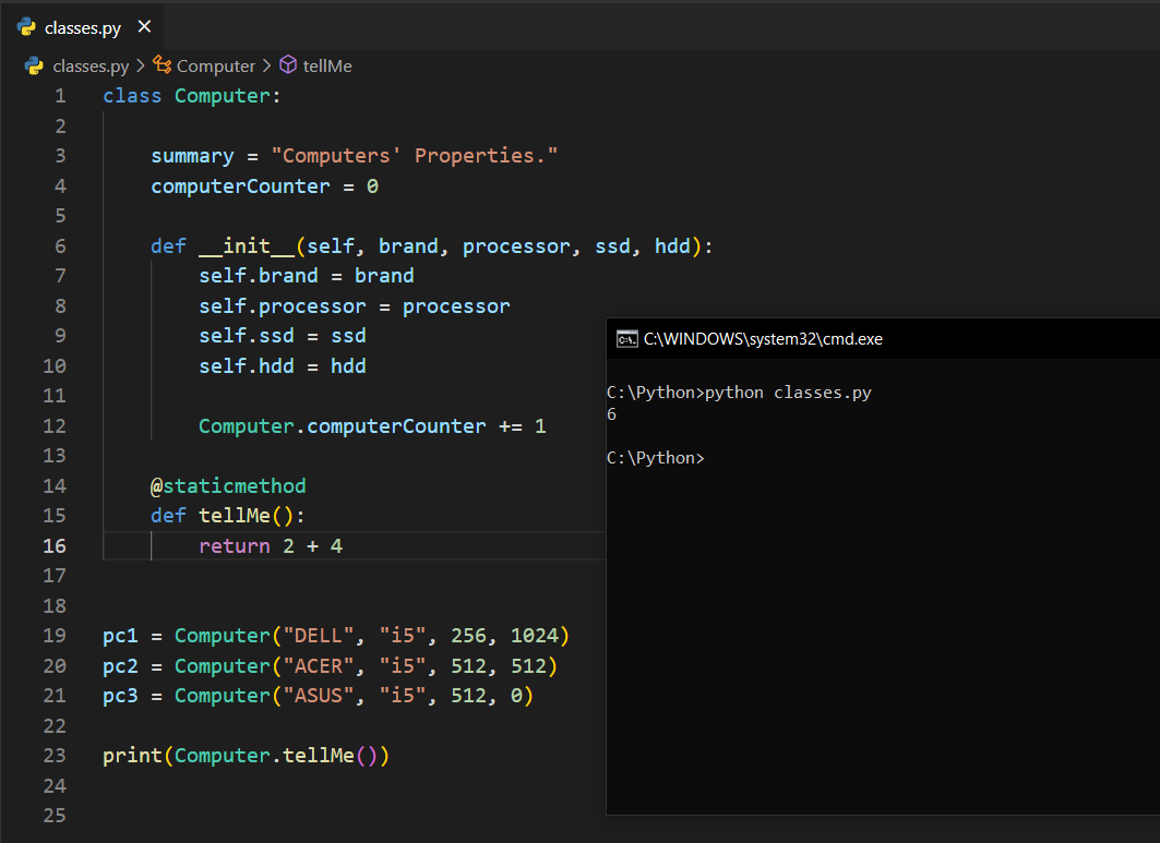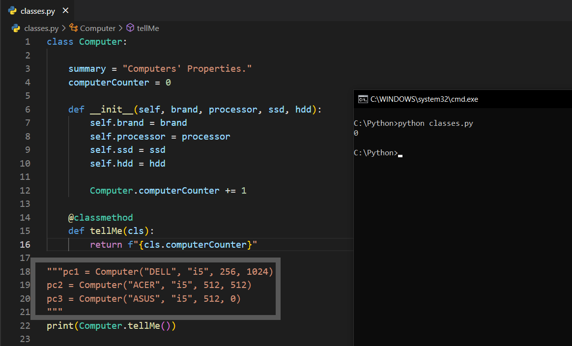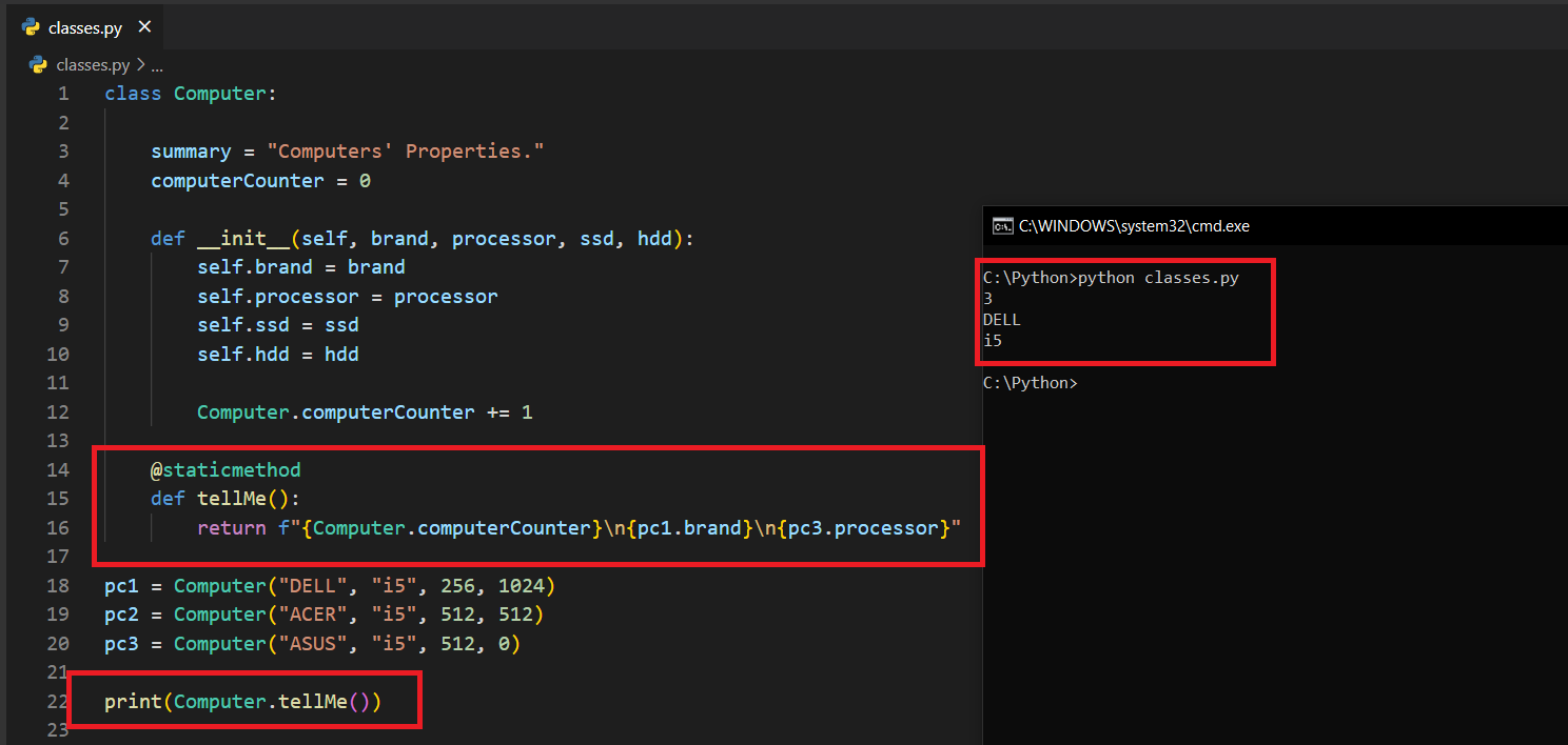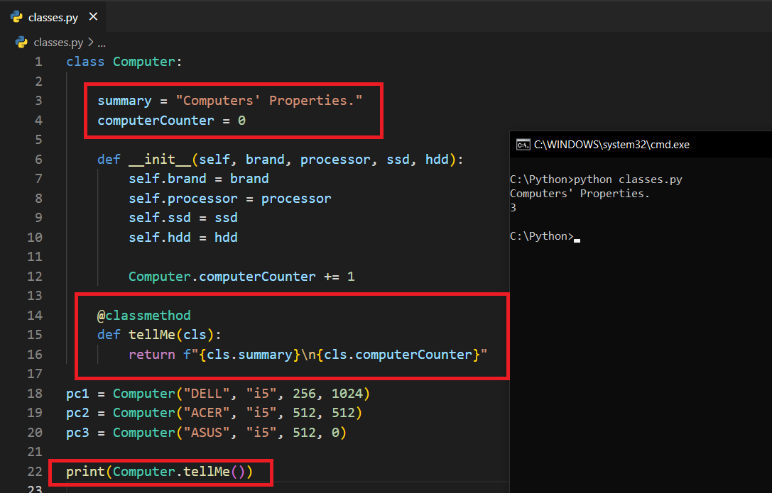 tellMe(cls) şeklinde bir class metot (@classmethod) oluşturdum ve içine, class değişkenlerini yazdıracak kodu yazdım. Sonrasında print(Computer.tellMe()) şeklinde bunu çalıştırdım ve çıktı gayet başarılı bir şekilde geldi.