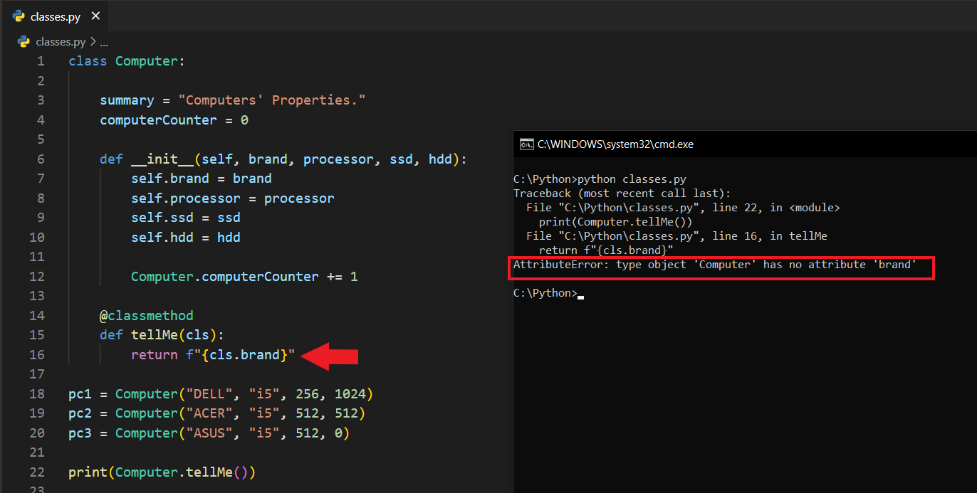 cls.brand dedim ama AttributeError şeklinde bir hata aldım. Bu hata bize şunu diyor: "Özellik Hatası: Computer sınıfının brand diye bir özelliği yok". Neden böyle oldu?