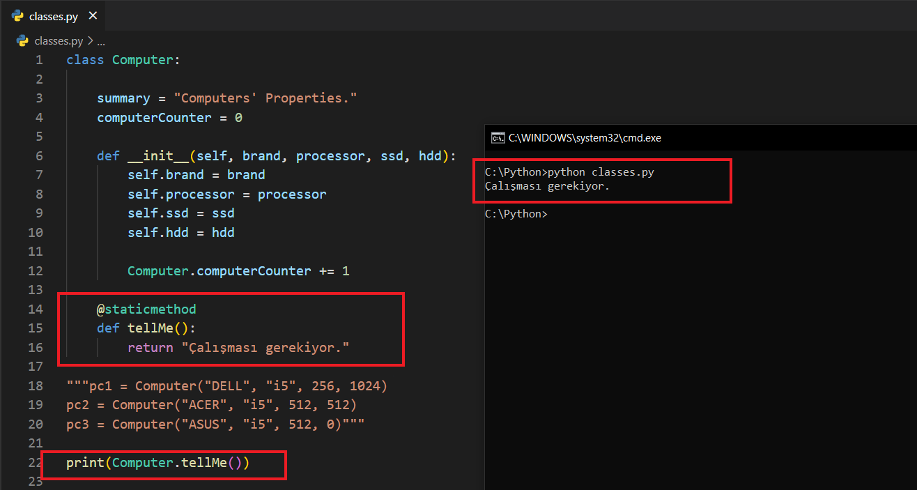 Gördüğünüz gibi nesneleri yani instance yapılarını yorum satırına dönüştürdüm. Yani bunlar çalıştırılmayacak. Dolayısıyla hiç tanımlanmamış gibiler. Kısacası class yapısının herhangi bir nesnesi yok. Buna rağmen @classmethod ile tanımladığımız metodun çalıştığını ve bize bir sonuç döndürdüğünü görüyorsunuz. Yani class yapınız içerisinde sadece class değişkenleri ile oynamak istiyorsanız, class yapısının tamamını etkileyen kodlar yazacaksanız ya da nesnesi olmayan bir class yaratmak istiyorsanız @classmethod kullanmalısınız.
