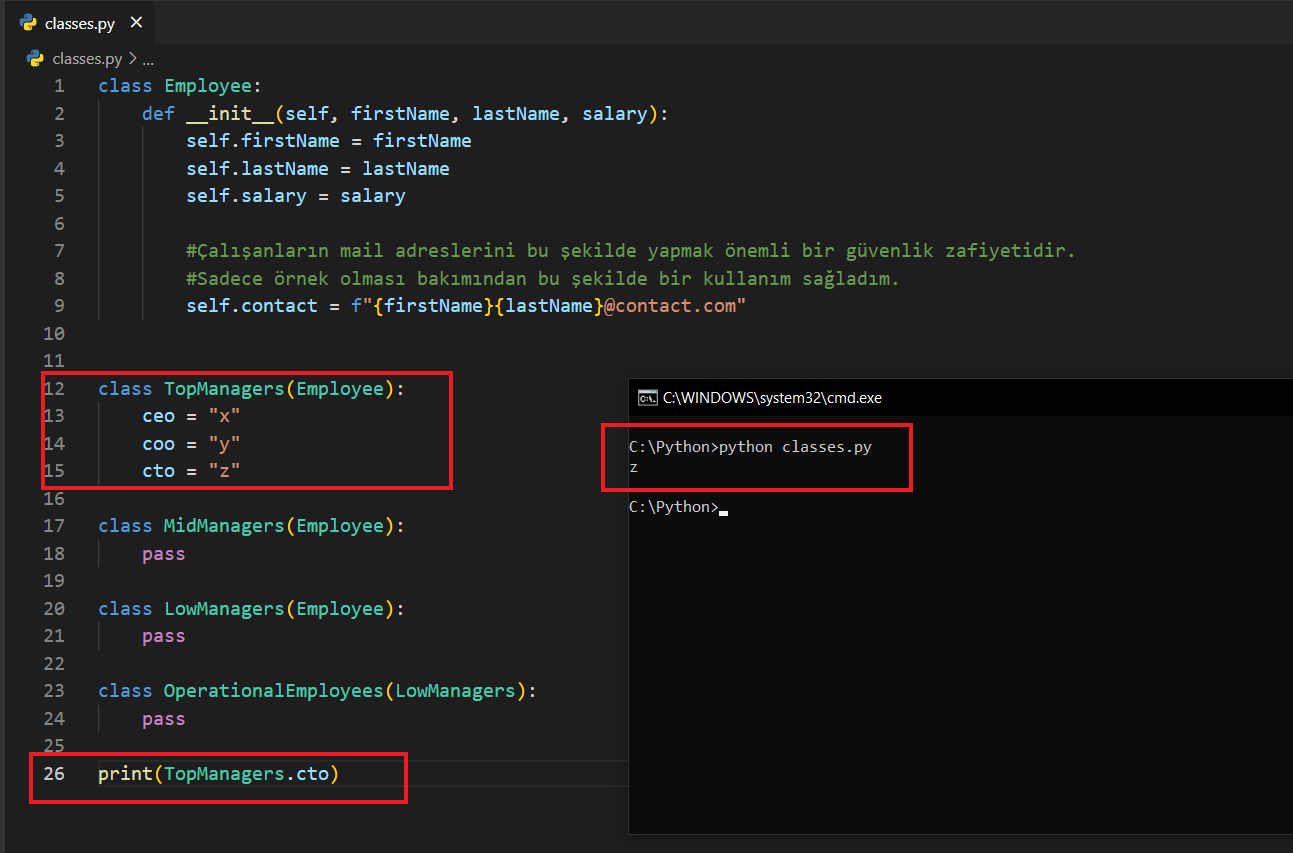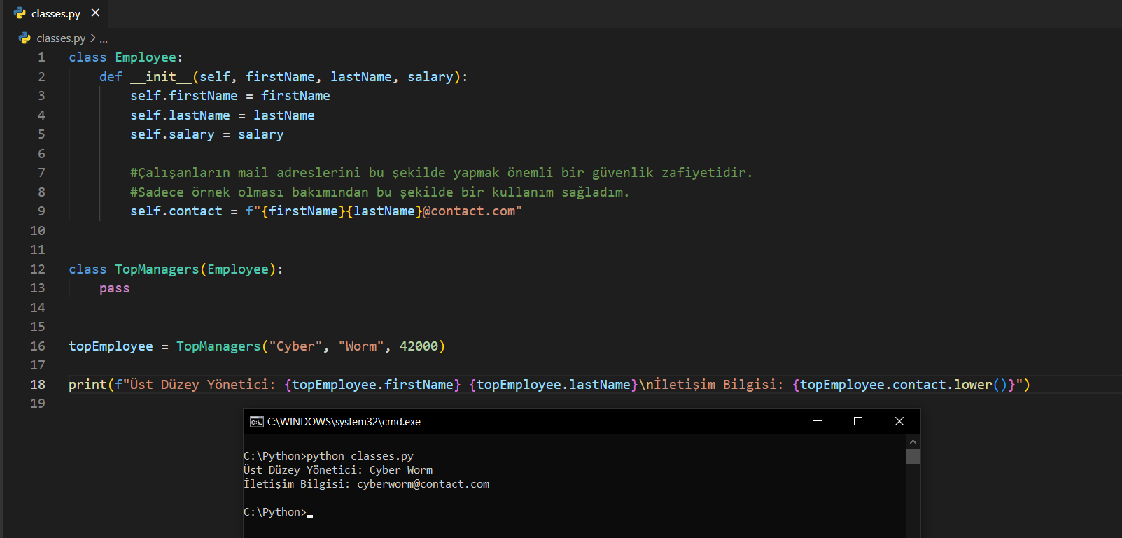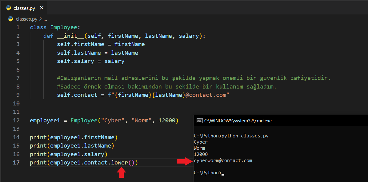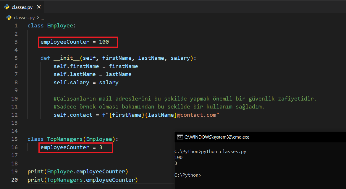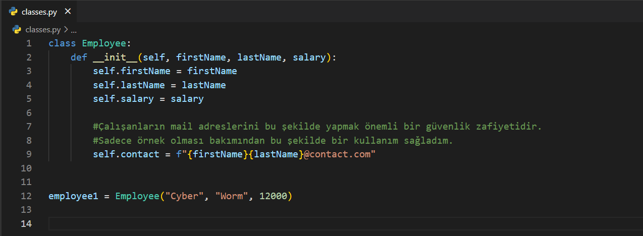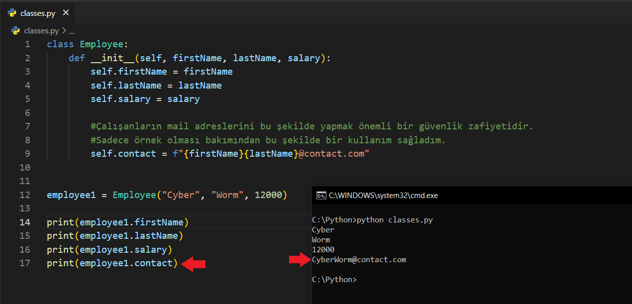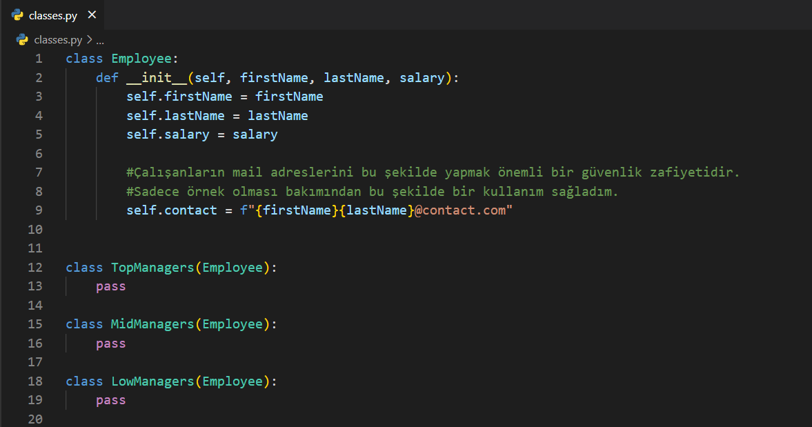 Bu noktada 9. satıra bakarsanız değişik bir şey yaptığımı göreceksiniz. Çalışanların mail adreslerini (contact), __init__ içerisine vermeden direkt olarak tanımladım. Bu, yapılabilir bir şeydir. Eğer bunu __init__ içerisine verseydiniz self.contact = contact demek zorunda kalırsınız ve bu tanımlamayı sonradan yapmanız gerekecektir.