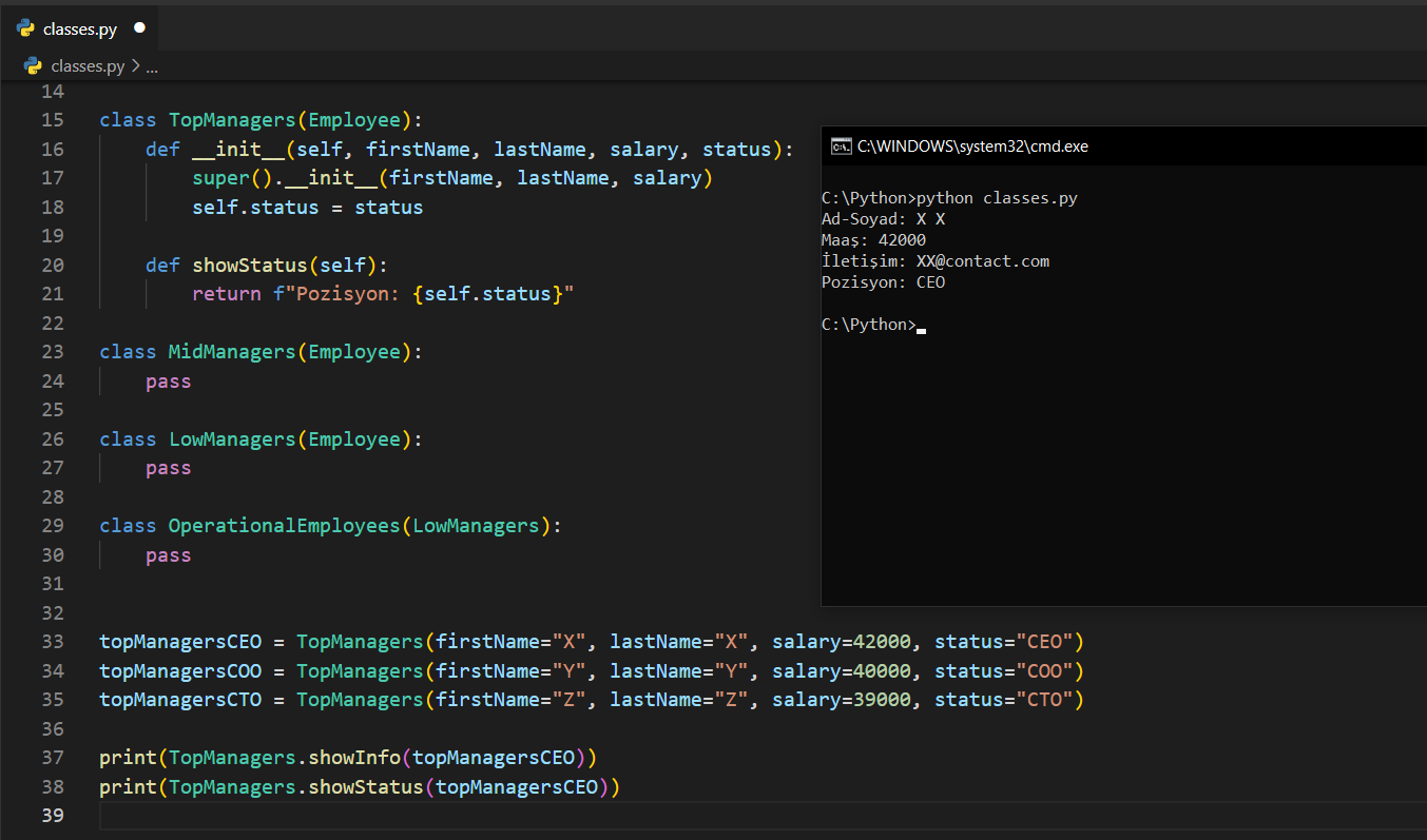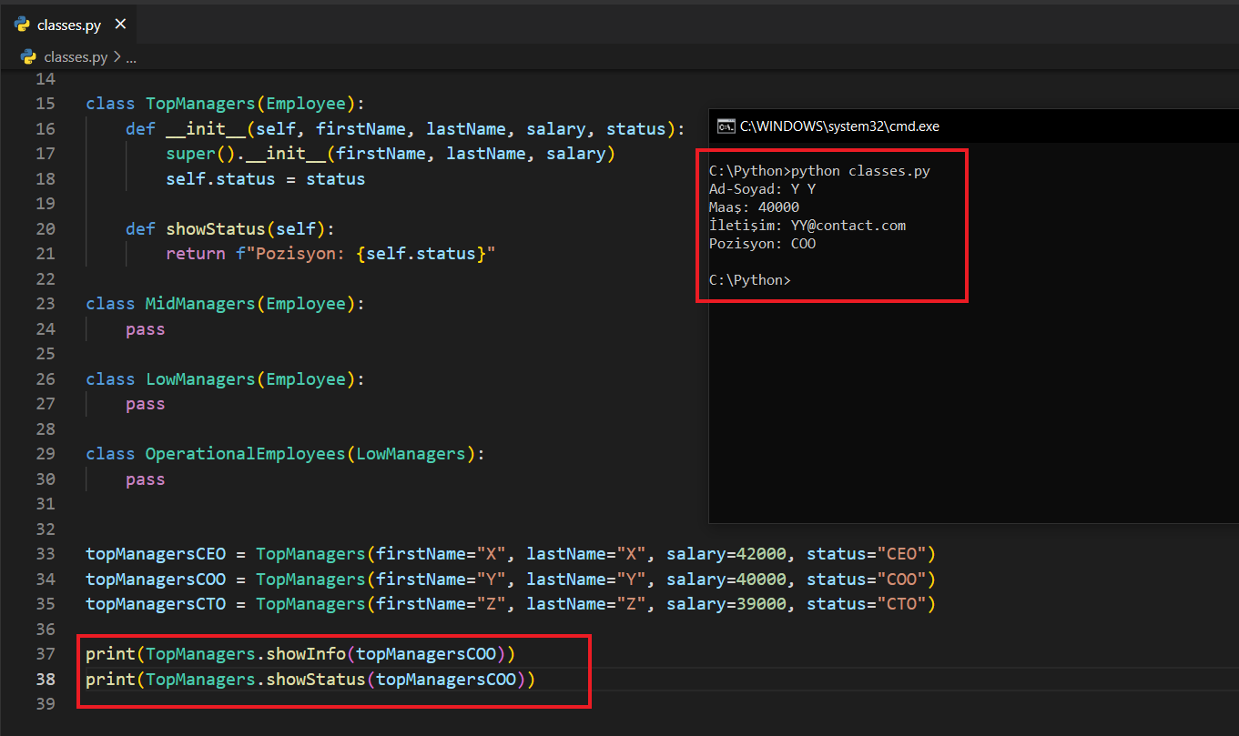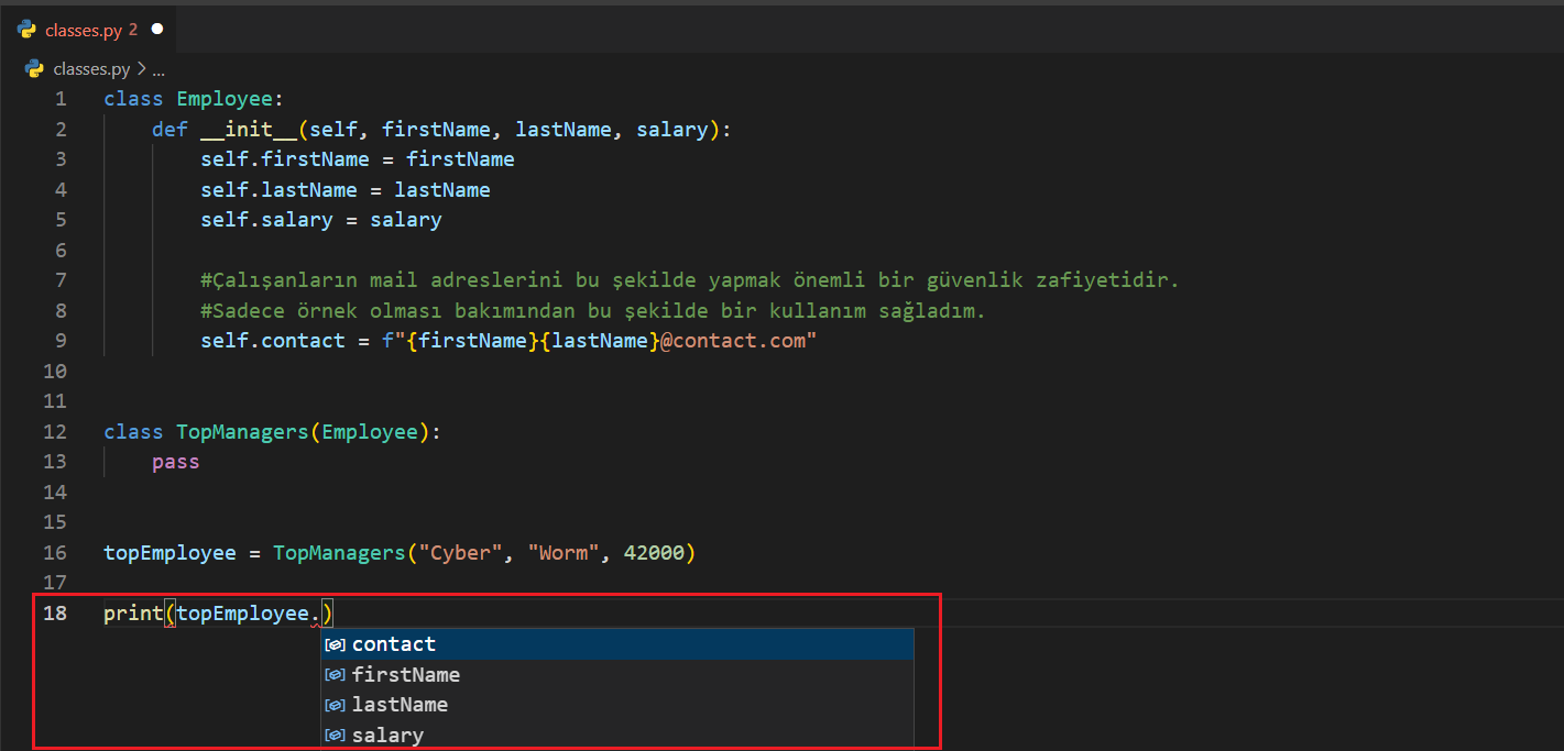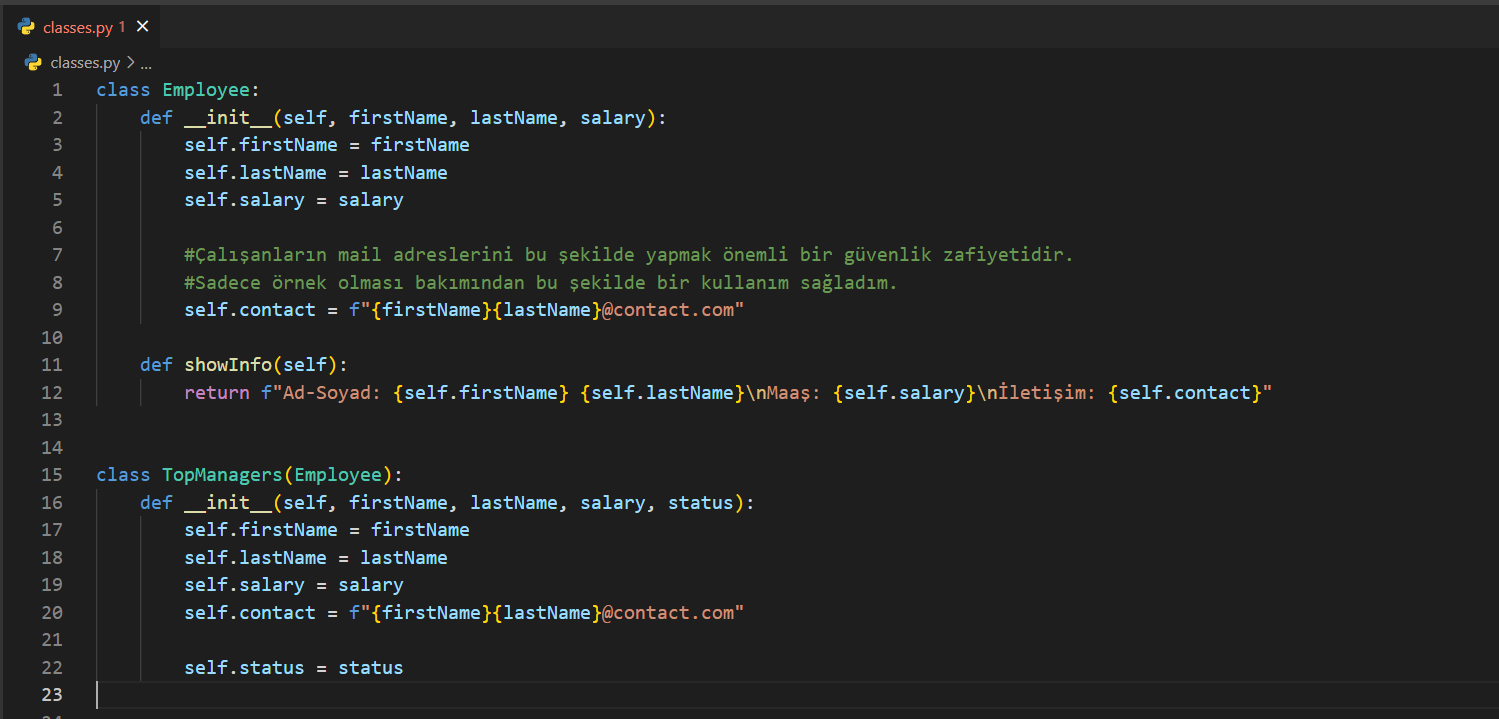 topEmployee = TopManagers(...) derken aslında TopManagers isimli class için bir nesne oluşturdum, öyle değil mi? Ancak TopManagers sınıfı içerisinde ne bir __init__ metodu ne de başka bir metot mevcut; yalnızca pass komutu var. Buna rağmen biz, Inheritence yapısını kullandığımız için TopManagers isimli sınıfa ait bir nesne için Employee isimli sınıf üzerinden özellik çekebiliyoruz. Bence bu harika bir mimari.