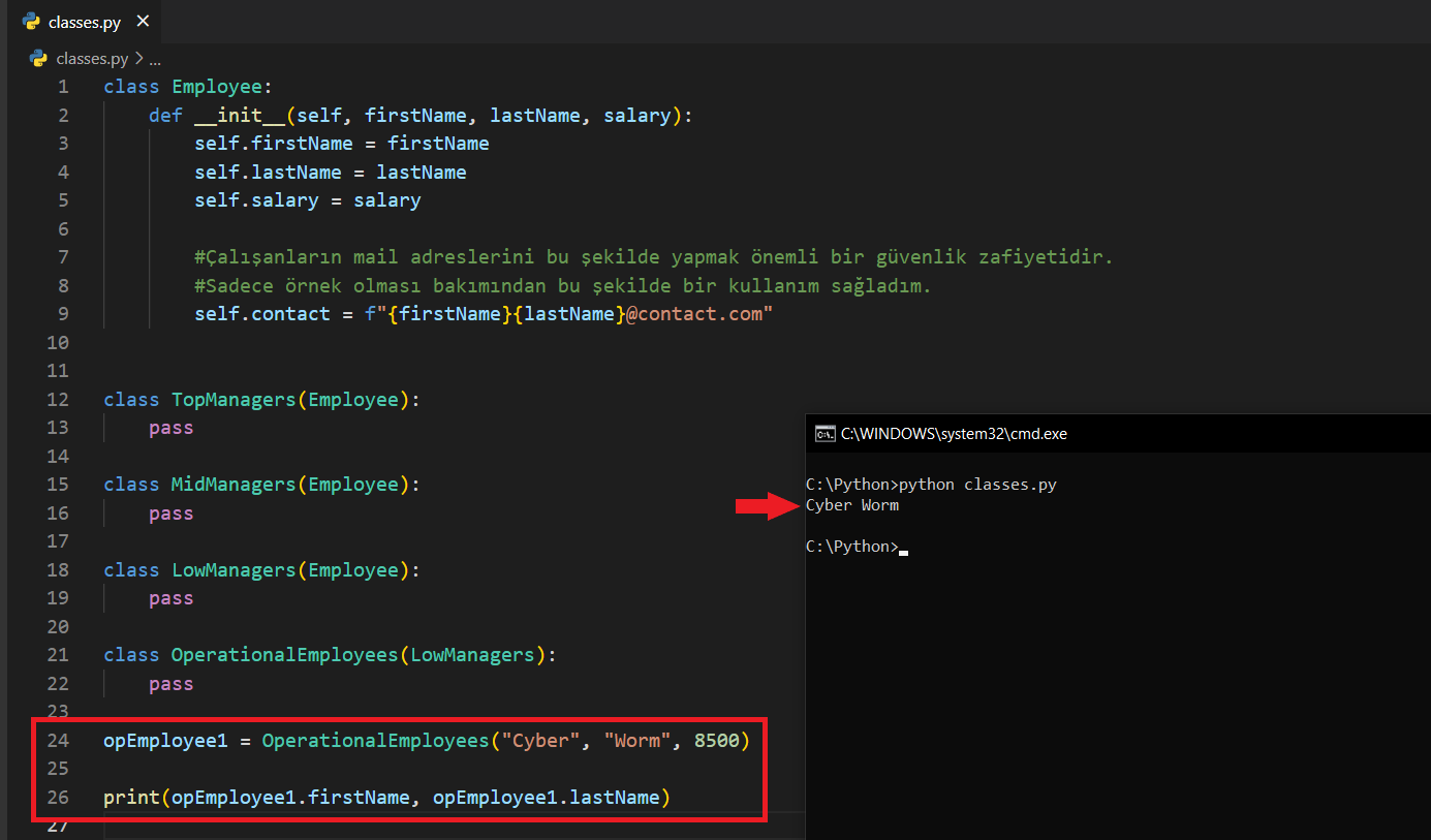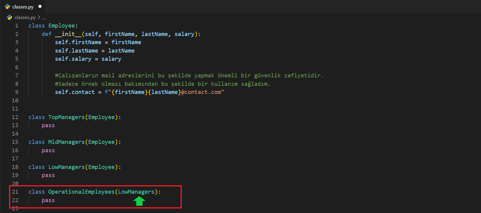 Şimdi, yönetici sınıflarını tanımladık. İşletmelerde bir de "operasyonel çalışanlar" vardır. Bunlar, operasyonel (alt kademe) yöneticilere bağlıdırlar. Elbette, genel olarak birden fazla yönetim şekli vardır; konumuz bu değil ama bu noktada biz, emir-komuta zincirinin yukarıdan aşağı doğru olduğunu varsayıyoruz. Üst kademenin verdiği karar alt kademeye kadar ulaşır ve alt kademe, operasyonel çalışanlara bu işleri yaptırır. Tam olarak bu noktada, bu mantığa göre dilerseniz class MidManagers(Employee) demek yerine class MidManagers(TopManagers) diyebilirsiniz. Aynı zamanda class LowManagers(Employee) demek yerine class LowManagers(MidManagers) diyebilirsiniz.