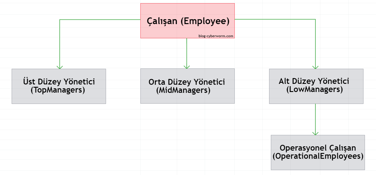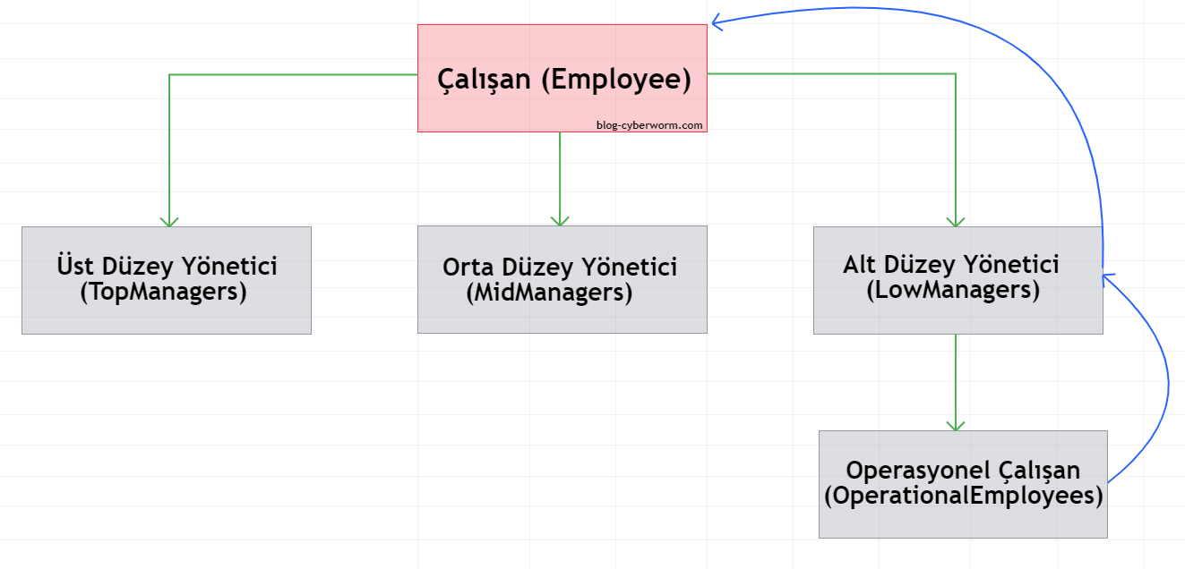 Yukarıdaki şema, bizim biraz önce kodlara döktüğümüz yapıyı gösteriyor. Yeşil oklara dikkat ederseniz bunların birbirine bağlı olduğunu görürsünüz. Yani Orta Kademe Yöneticiler (MidManagers) Çalışan (Emplooye) sınıfına bağlı. Aynı zamanda Operasyonel Çalışanlar (OperationalEmployees) Orta Kademe Çalışan (MidManagers) sınıfına bağlıdır. Dolayısıyla bunlar arasında bir korelasyon mevcut ve bunlar birbirini tanıyor. Bunu dede-baba-çocuk ilişkisi gibi düşünebilirsiniz.