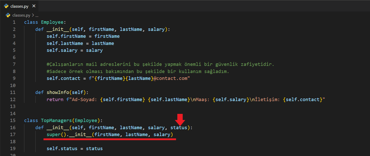 Employee sınıfında yaptığımız gibi TopManager sınıfı için bir __init__ tanımladık ve her şeyi tekrar yapmış gibi olduk. Buradaki tek fark, status özelliğidir. status özelliğini eklemek istedim. Ancak burada büyük bir sorun var; kod tekrarı. Çok fazla kod tekrarı yaptığımız için bir süre sonra her şey karmakarışık olacaktır. İşte, bu tanımlamanın kısa yolunu göstereceğim.