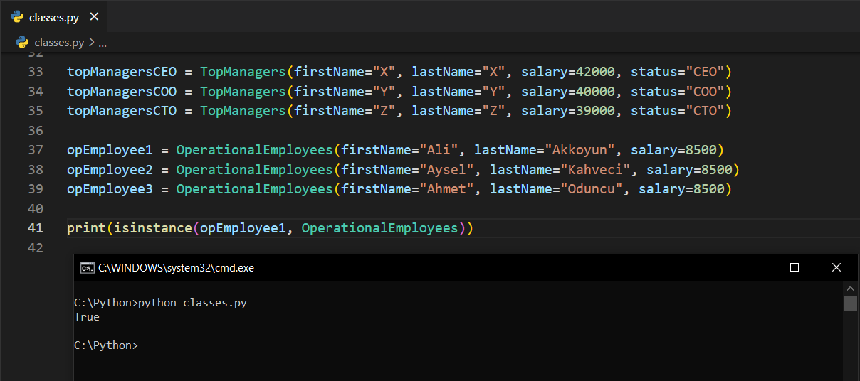 Burada, opEmployee1 isimli nesnenin, OperationalEmployees isimli class'a ait olup olmadığını sorguladık ve sonuç True geldi. Gerçekten de OperationalEmployees sınıfına ait bir instance.