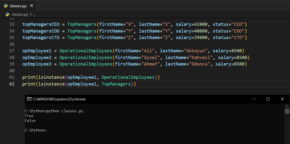 42. satırda gördüğünüz üzere opEmployee1 nesnesinin TopManagers class'ına ait olup olmadığını sorguladık ve ait olmadığı için False değer döndü.