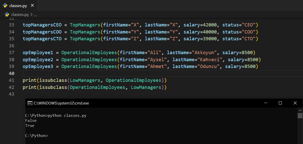 41. satırda LowManagers sınıfının OperationalEmployees sınıfının bir alt sınıfı olup olmadığını sorguladık ve False değer döndü. Çünkü aslında OperationalEmployees sınıfı LowManagers sınıfının bir alt sınıfı konumunda. Zaten 42. satırda bunu görüyorsunuz; sonu. True şeklinde.