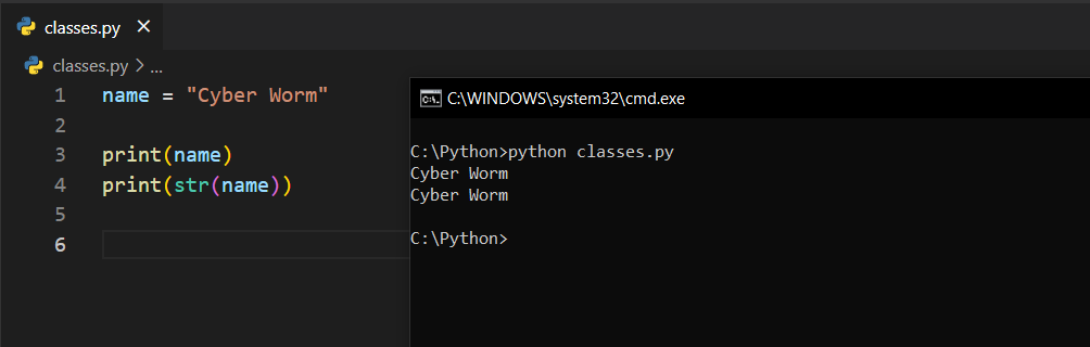 name = "Cyber Worm" şeklinde bir şey tanımladım. Sonrasında sade bir şekilde print(name) ifadesini verdim. Son olarak aynı şeyi str() ile yazdırdım. Bu kullanımları önceki bloglardan biliyorsunuz. Ancak, arka planda gerçekten ne olduğunu hiç düşündünüz mü?