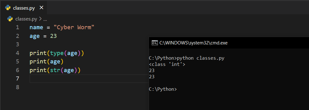 Bu sefer age = 23 şeklinde int bir değişken atadım. type(age) dediğimde bunun int sınıfına ait olduğunu söyledi. Sonrasında print(age) ve print(str(age)) dediğimde aynı çıktıyı sorunsuz bir şekilde gördüm. Şimdi, işin sırrını öğrenelim.