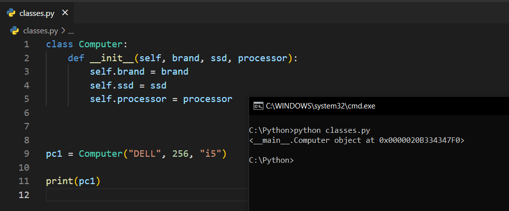 Bir class ve pc1 isimli bir instance oluşturdum. Bu noktada print(pc1) dediğim zaman karşıma değişik bir çıktı geldi. Bu aslında şunu diyor: "Bu bir objedir ve bu obje hafızada '0x00...' şuradadır". Demek ki Python bunun bir obje olduğunun farkında ama bunu nasıl yazdıracağını bilmiyor. Dolayısıyla bunu yazdırmak yerine bize bu işlem ile alakalı bazı bilgiler döndürüyor.