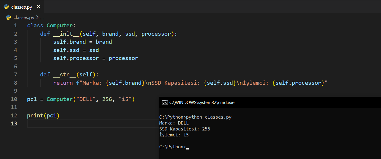 def __str__(self): şeklinde bir tanımlama yaptık ve içerisine, daha önce de yaptığımız gibi return ile döndürülecek ifadeyi verdik. print(pc1) dediğimizde her şeyin sorunsuz bir şekilde çalıştığını ve __str__ içerisinde tanımladığımız gibi bir çıktı geldiğini görüyorsunuz.