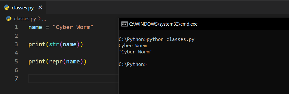print(str(name)) dediğimde normal bir şekilde çıktı aldık; Cyber Worm. Ancak aynı işi repr() ile yaptığımızda 'Cyber Worm' şeklinde bir çıktı geldi. Dikkat ederseniz bu çıktı, tırnak işaretleri arasında geldi ve bize bunun bir string olduğunu vurguluyor gibi duruyor. Daha spesifik sonuçları olan bir örnek verelim.