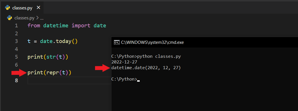 Daha önceden bildiğiniz modülü kullanarak bugünün tarihini yazdırdım. Bu noktada print(str(t)) dediğim zaman normal bir şekilde tarihi yazdırdığını görüyorsunuz. Ancak aynı yazdırma işlemini repr() ile yaptığımda daha farklı bir sonuç çıktı; datetime.date(2022, 12, 27). Yani bize, bu sonucun datetime modülüne ait olduğunu, date metodunu kullandığını ve verilen parametreleri yazdırıyor.