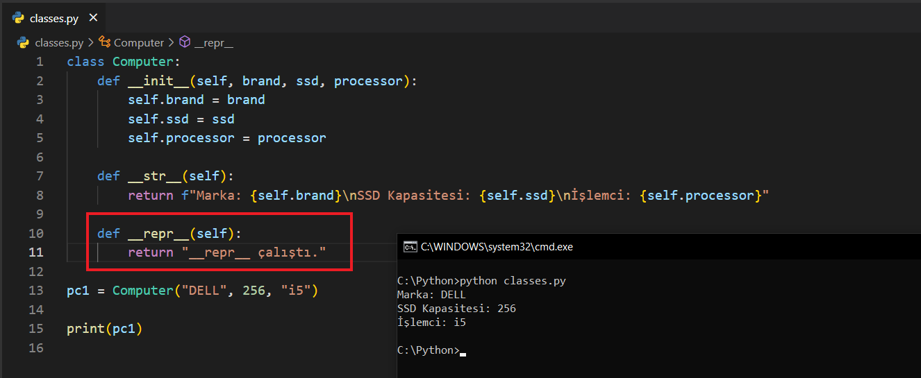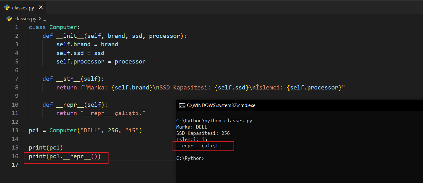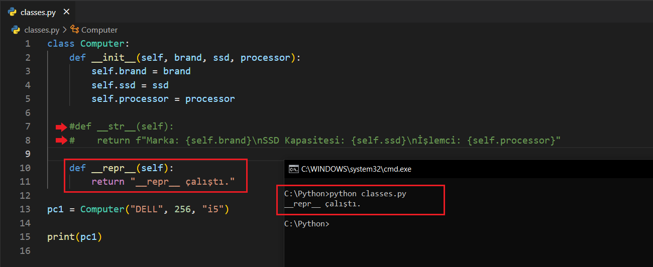 __str__ metodunu yorum satırına alıp kodu çalıştırınca __repr__ metodunun çalıştığını göreceksinizdir. Python __str__ için sınıfın içine baktı ama bulamadığında __repr__ çalıştı. Hatta dikkat ederseniz print(pc1.__repr__()) demedim. Buna rağmen çalıştı.
