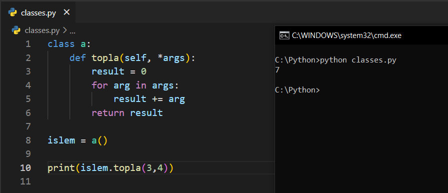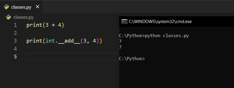 Dikkat edelim; aynı sonucu aldık. Bu noktada aslında int sınıfı içerisindeki __add__ metoduna eriştik ve ona verdiğimiz parametrelerle bu işlemi gerçekleştirdik. Nasıl ki fonksiyon tanımlarken argüman veriyoruz, aynı işlem. Örneğin;