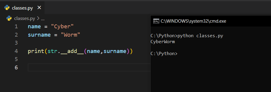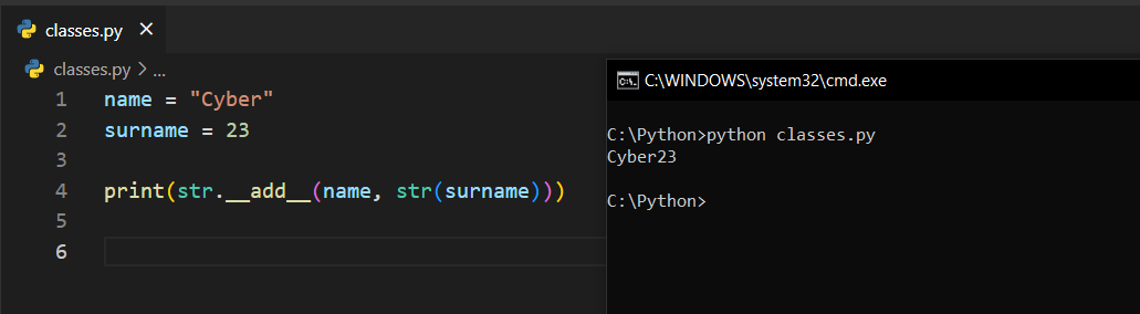Normalde surname değişkeninin tuttuğu değer int tipinde. Ancak biz, str(surname) dediğimiz için Python sorun yaratmadı ve işimizi gördü. Biraz önce int sınıfındaki __add__ metoduna eriştik. Şimdi ise str sınıfı içerisindeki __add__ metoduna erişiyoruz. Ayrıca Type Conversion yaptığınızda aslında arka planda Python'a ne kadar yardımcı olduğunuzu görüyorsunuz.