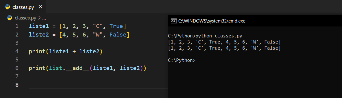 Normalde iki listeyi birleştirmek için print(liste1 + liste2) diyorduk ama aslında bunu yaparken arka planda list sınıfının __add__ metodu çalışıyor.