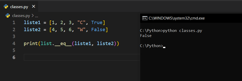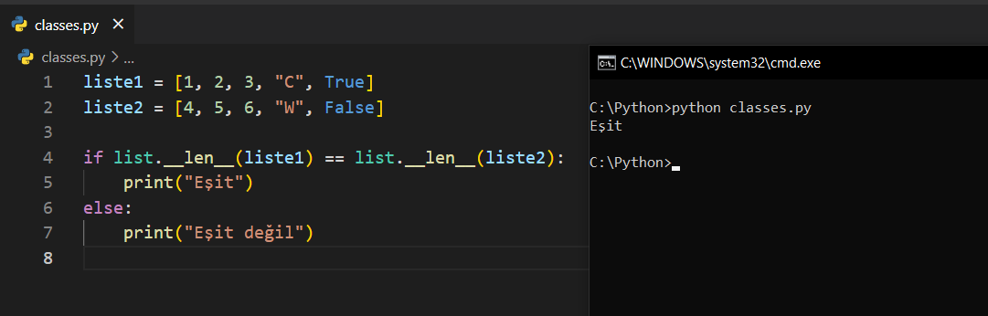 Mesela başka bir dunder metot kullanalım. Örneğin bu iki listenin birbirine eşit olup olmadığını kontrol edelim.