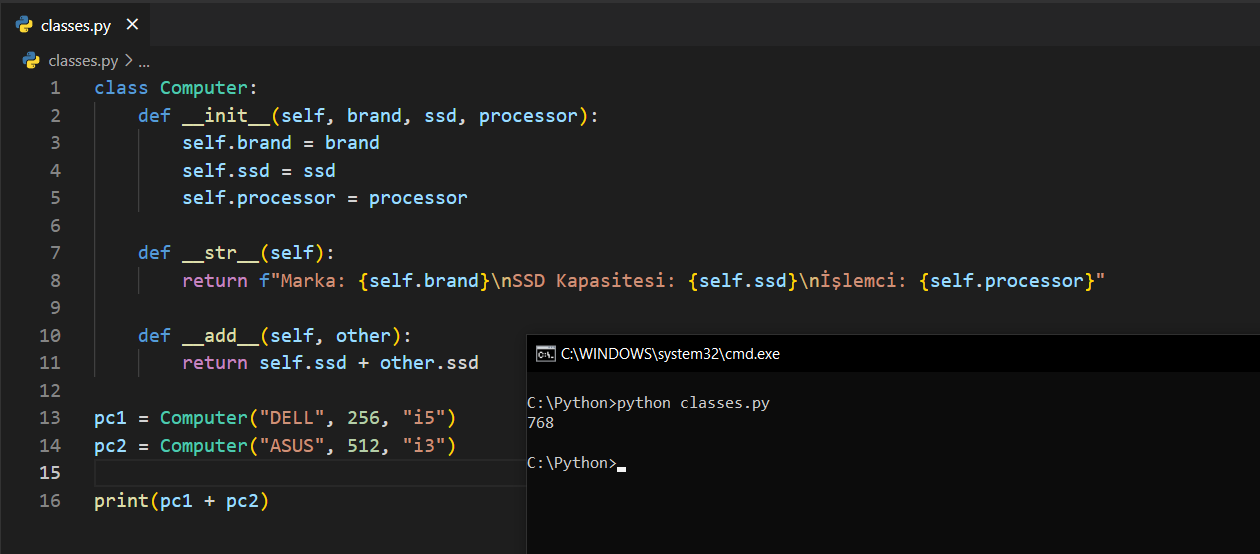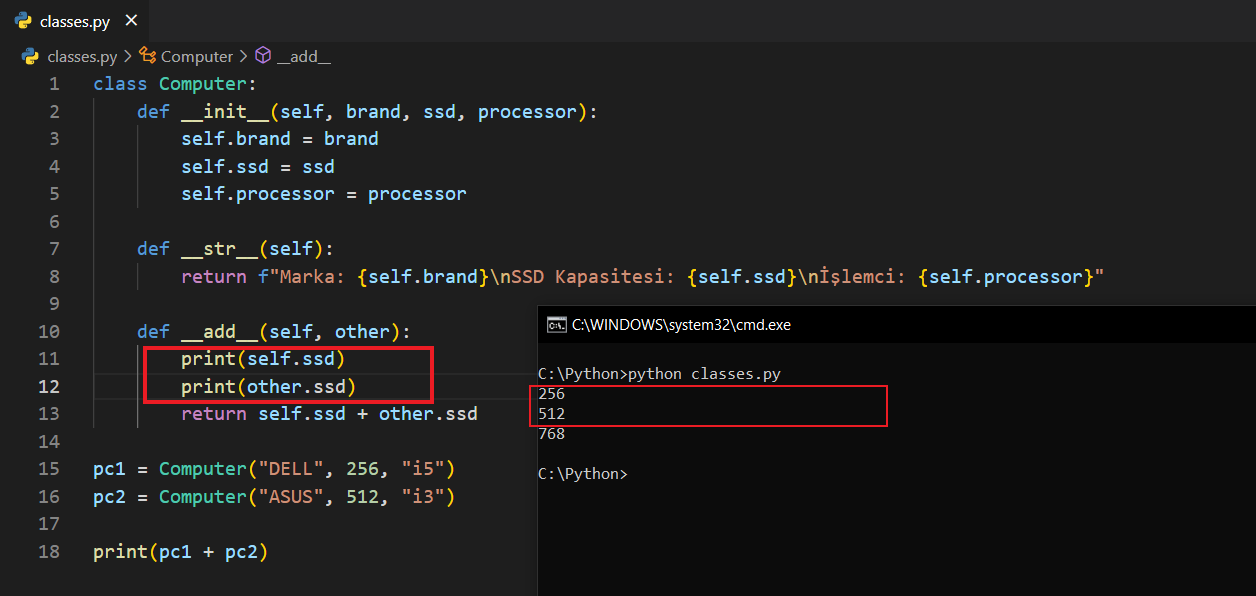 Bunu test etmek için ilk önce print(self.ssd), sonra da print(other.ssd) dedim ve self.ssd ifadesinin sonucu 256 olarak geldi. Bu, pc1 nesnesinin SSD değeriydi. other.ssd ifadesinin sonucu ise 512 olarak geldi. Bu da pc2 nesnesinin SSD değeriydi. Dilerseniz __add__ ile ilgili bir örnek daha yapalım. Hem de other ifadesinin mantığını daha iyi kavramış oluruz.