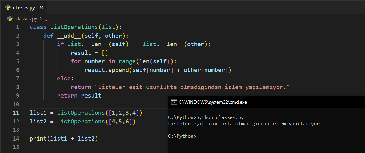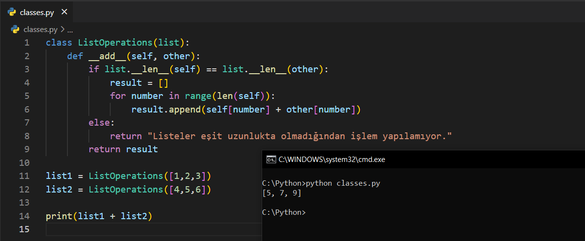 Sonrasında def __add__(self, other): dedik ve aşağı indik. Metodun içerisindeki ilk komut self listesinin other listesine eşit olup olmadığını kontrol ediyor. Yani if list.__len__(self) == list.__len__(other) ifadesi bunu gerçekleştiriyor. İsterseniz bunu direkt olarak if len(self) == len(other) şeklinde de yazabilirsiniz; ben görmeniz için yaptım. Listelerin eşit uzunlukta olması, aynı index'te bulunan elemanların toplanması için gereklidir.