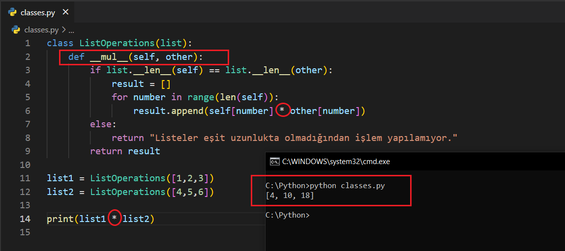 Değiştirdiğim kısımları kırmızı renkli kutucuk ve dairelerle belirttim. list1 ve list2 içerisindeki elemanlar için aynı index'e denk gelenler çarpıldı ve sonuç ekrana verildi.