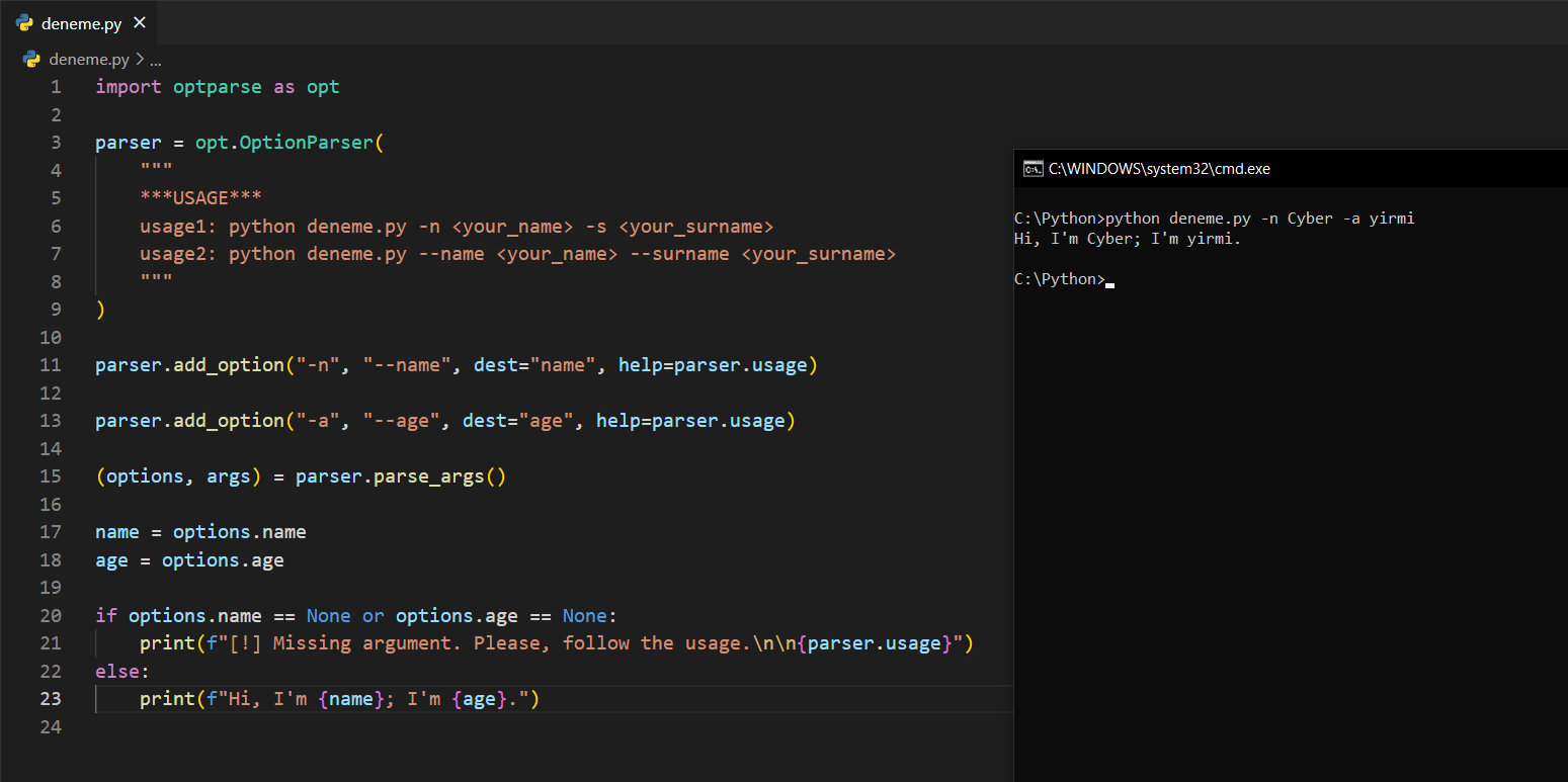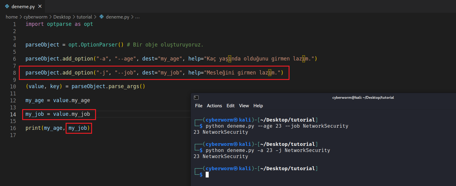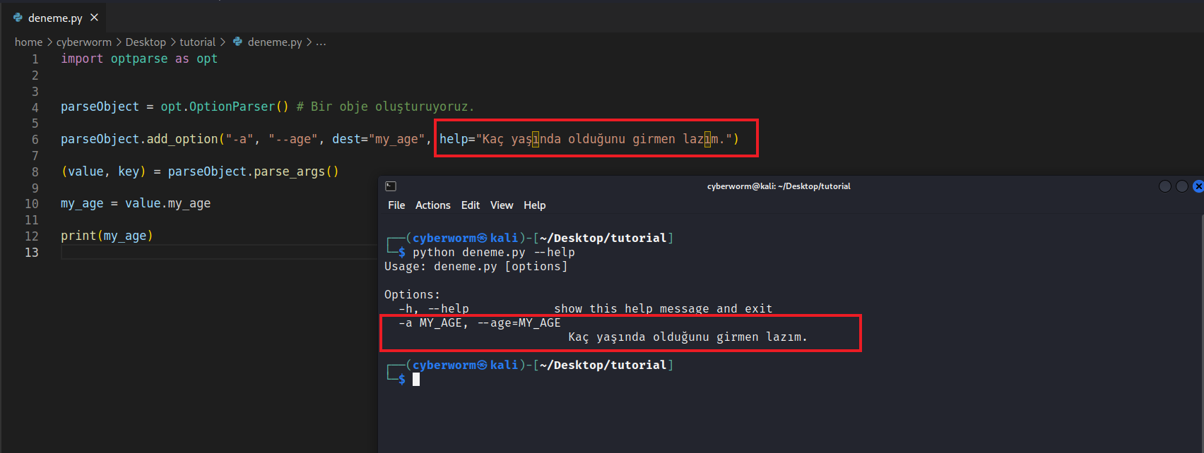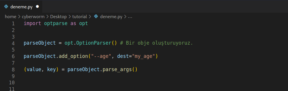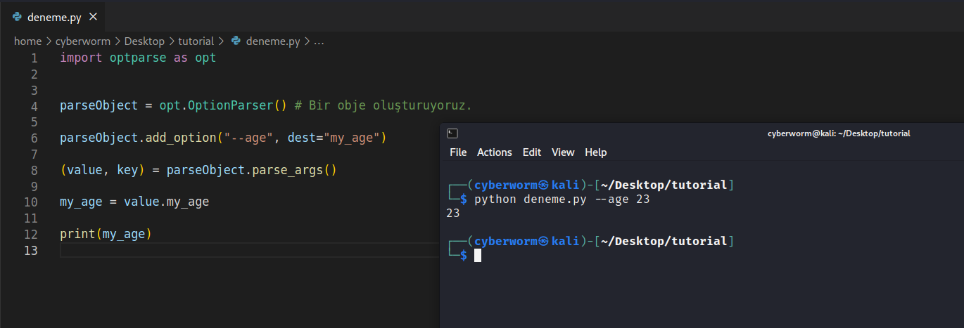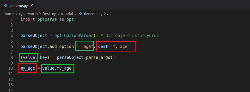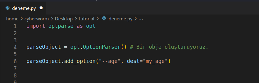 İlk önce bir obje oluşturduk. Bu objeyi, fonksiyonlara kolayca erişebilmek için oluşturduk. Sonrasında add_option() fonksiyonuyla opsiyonlar ekledik. Bu opsiyonlardan ilki (--age) value, ikincisi ise (dest=) key değeri oldu. Bunların value ve key olduğunu optparse'a anlatmak için de (value, key) şeklinde bir Tuple oluşturduk ve parse_args() fonksiyonu yardımıyla bunu optparse'a tanıttık.