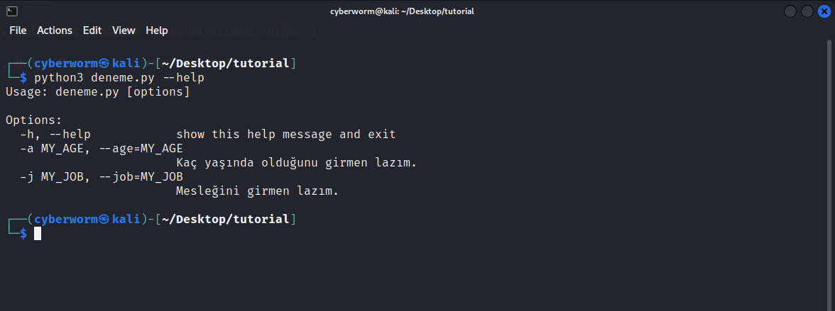 İlk önce '--help' gibi, '--age' şeklinde bir şey yazdık ve bir virgül koyduk. Buradaki '--age' bizim parametremiz oluyor. Eğer python deneme.py derken yanına --age koymazsak program çalışmayacaktır.