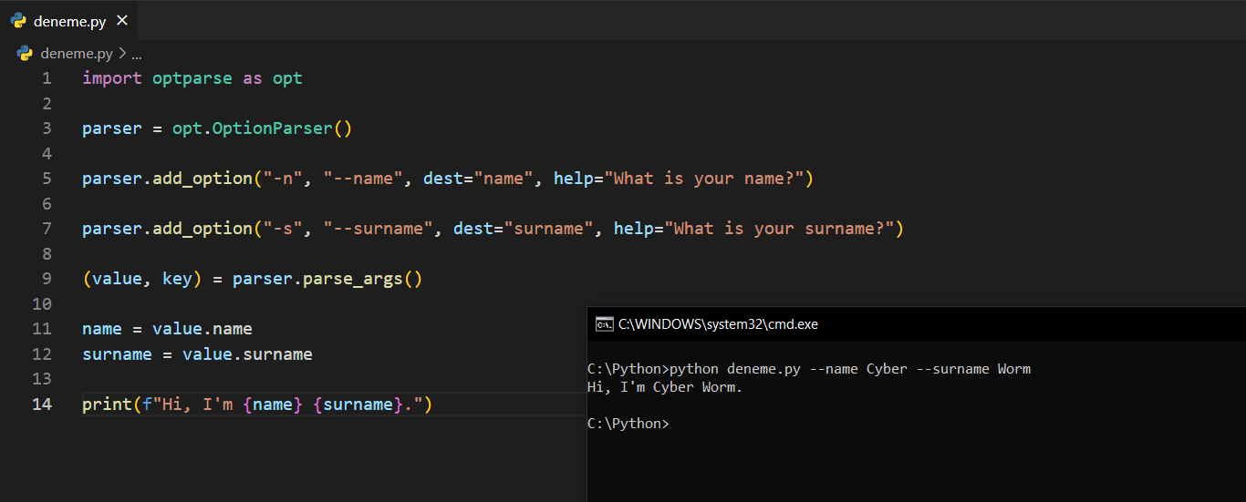 şeklinde normal bir değişkenmiş gibi algılayabilirsiniz. Arka planda olan şey tam olarak bu; sadece optparse yapısı burada bize biraz daha esneklik sağlıyor.