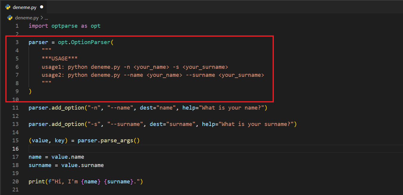 parser = opt.OptionParser() diyerek bir obje oluşturuyorduk. Aslında boş bıraktığımız bu parantezler arasına bir kullanım kılavuzu veya istediğiniz başka bir şeyi yerleştirebilirsiniz. Ancak bunu çağırırken print(usage) değil, print(parser.usage) olarak çağırmanız lazım. Artık parser objesinin başlı başına bir kullanım kılavuzu (usage) mevcut oluyor. Yani buradaki parser objesi artık bir string de tutuyor. O yüzden bunu 'parser.usage' olarak çağırmamız gerekiyor.